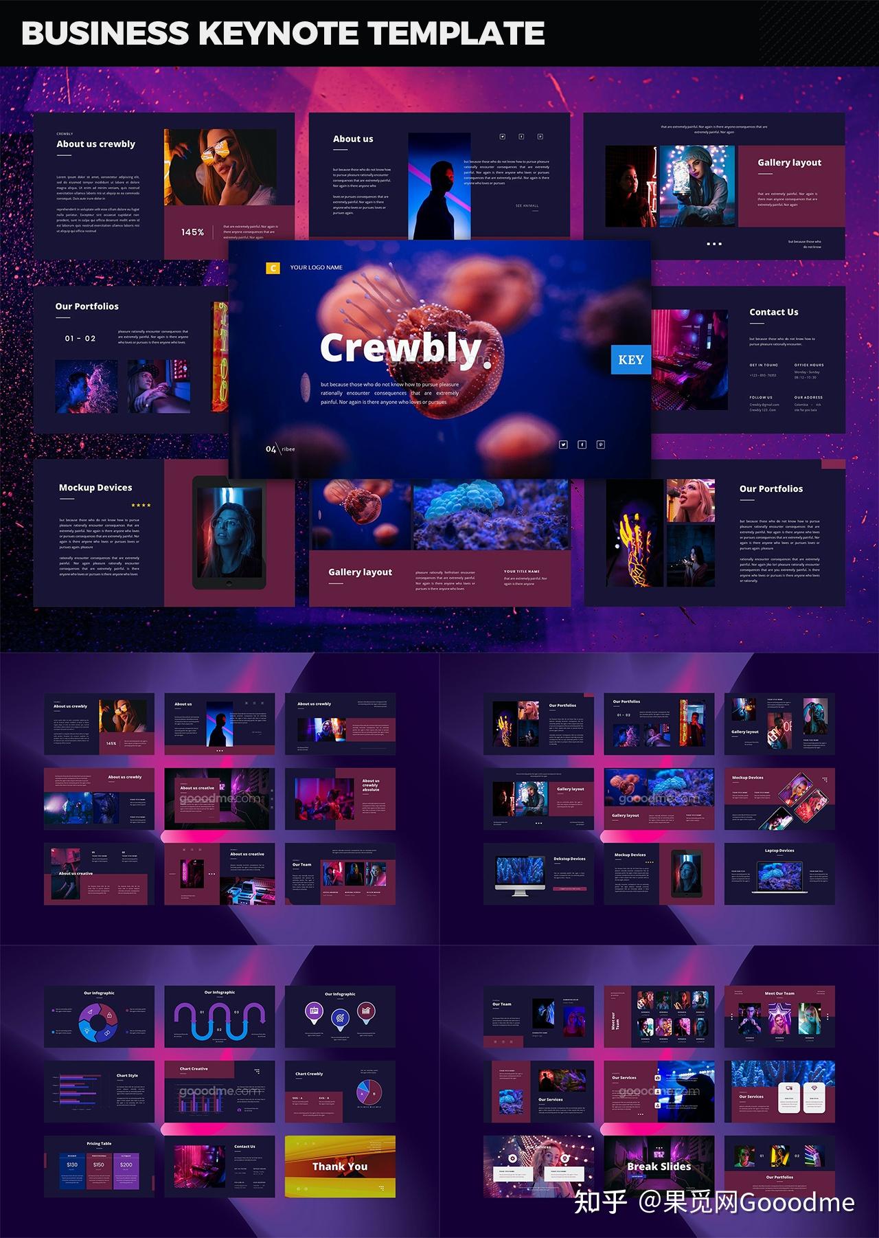 现代时髦电子竞技营销筹谋演示文稿设想Keynote+ppt模版▶ 深色气概的商务主题Keynote演示模板Crewbly – Business Keynote Template