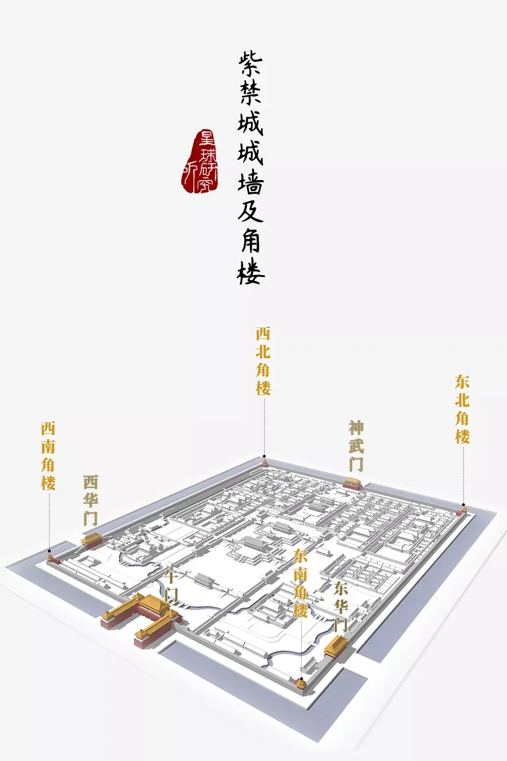 用于瞭望的角楼四面的屋顶彼此交叠培养了现存稀有的建筑形式(紫禁城城墙、城门及角楼示意,造图@张靖/星球研究所)▼