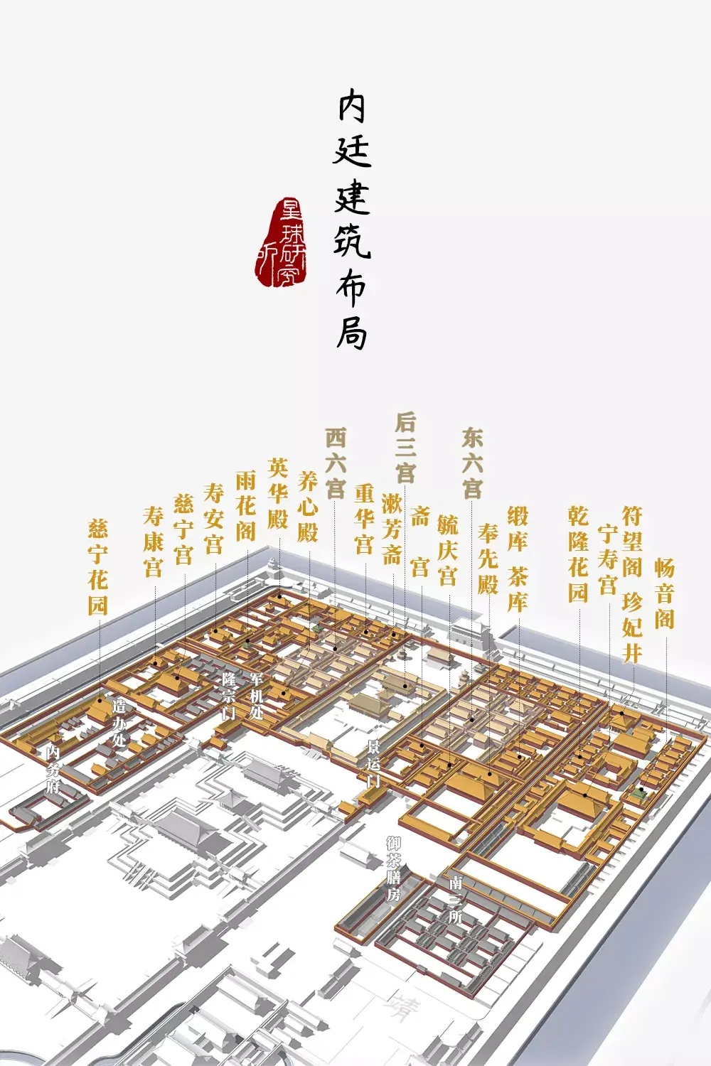 康熙皇帝还在此设立了南书房让有学之士轮流值班随时为皇帝答疑解惑(后三宫建筑规划,造图@张靖/星球研究所)▼
