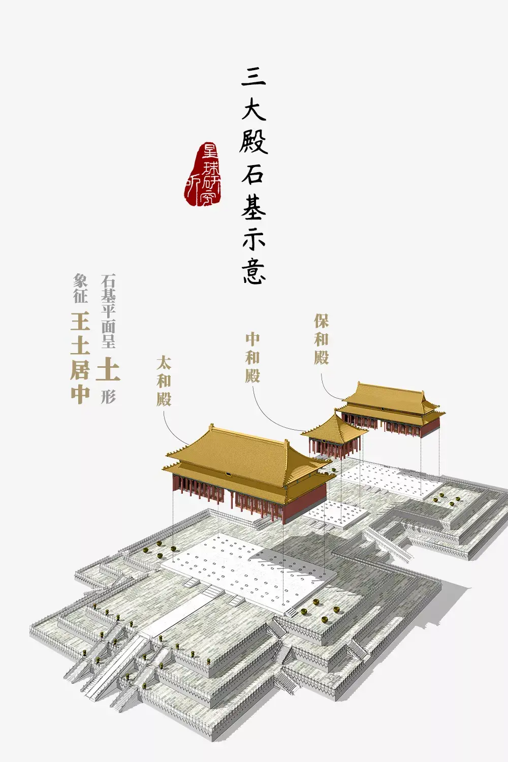 从空中俯视那三座大殿其基座的外轮廓呈现出“土”字的外形象征“王土居中”皇权至上、统御全国(三大殿石基示意,造图@张靖/星球研究所)▼