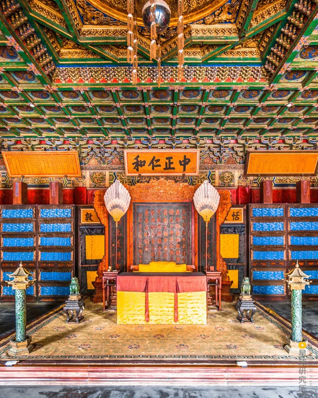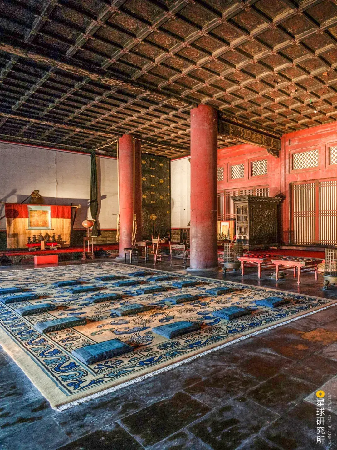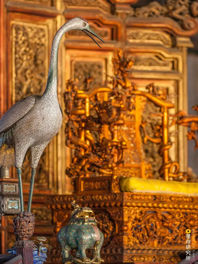 三大殿其三的保和殿固然仍为长方形但是与太和殿比拟其内部去掉六根柱子让利用空间愈加宽阔(三大殿建筑群,请横屏旁观,造图@张靖/星球研究所)▼