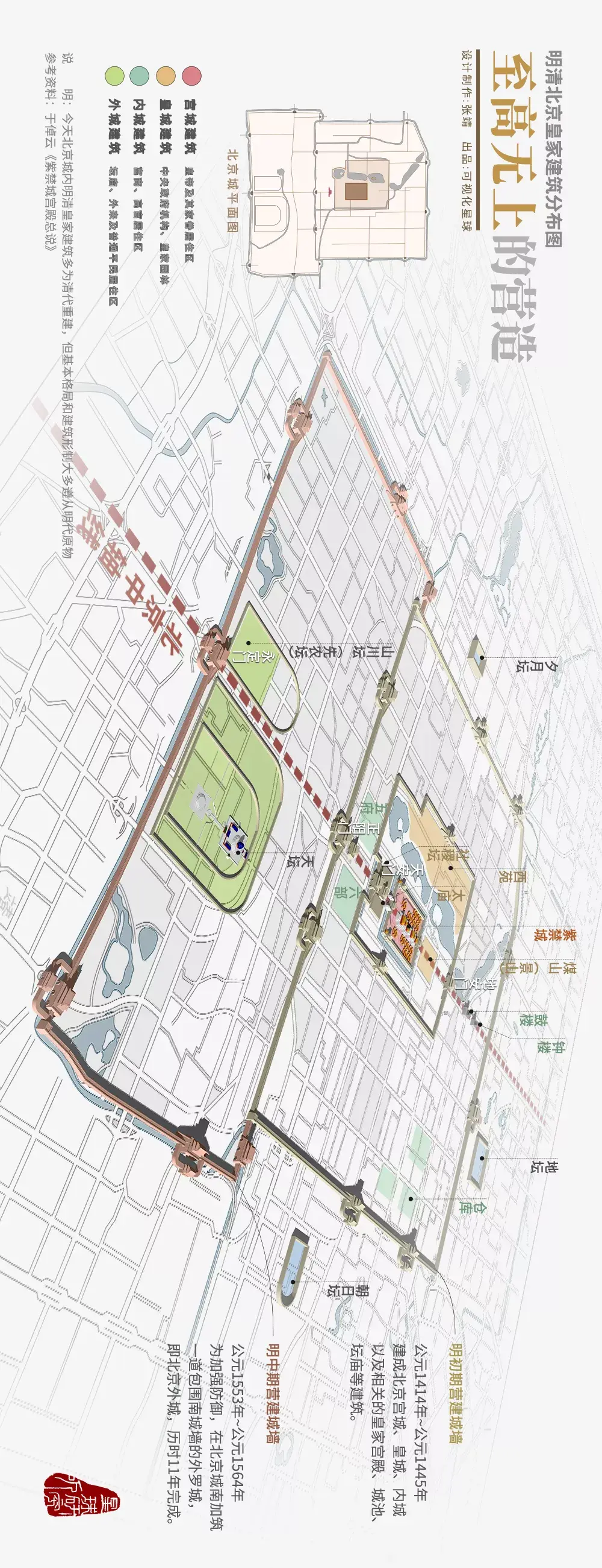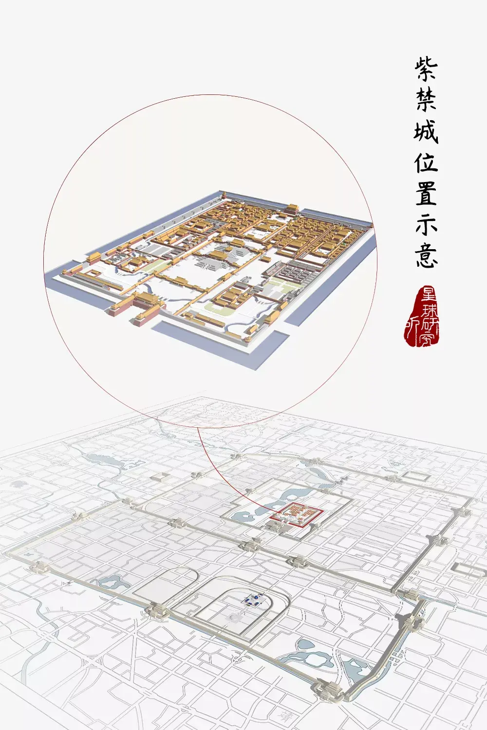 而皇城之中则是整座城中最核心的宫城别名“紫禁城”(紫禁城在北京城位置示意,造图@张靖/星球研究所)▼