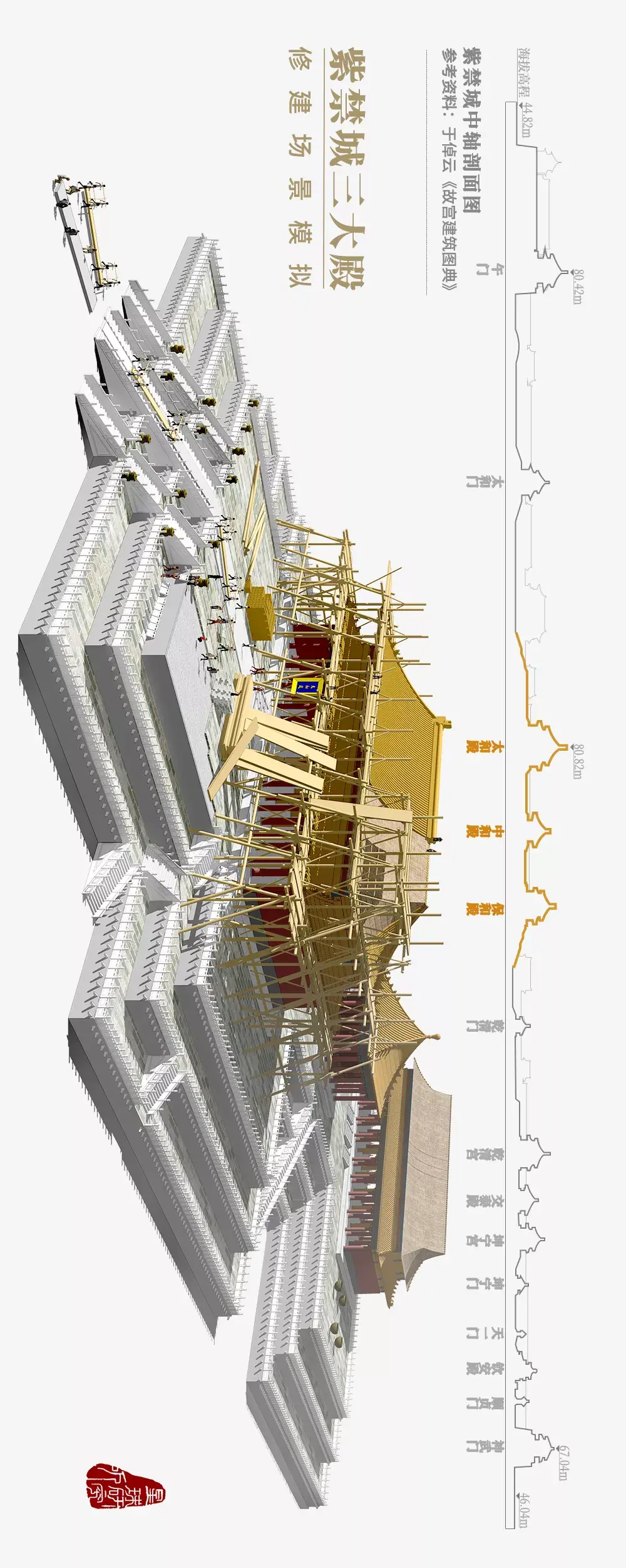 沿着“弓箭”的指引不断通往紫禁城的中心那里坐落着紫禁城宫殿的王者太和殿、中和殿、保和殿人称“三大殿”(三大殿示意,造图@张靖/星球研究所)▼