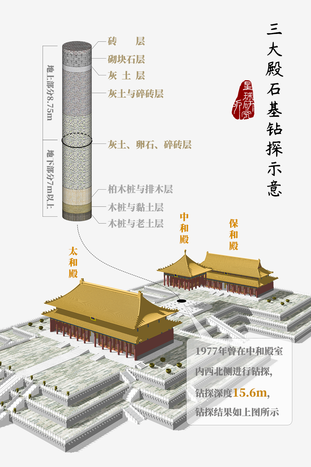 它从上到下都是顶级的设置装备摆设最顶级的屋顶重檐庑殿顶最顶级的门窗金扉金锁窗最顶级的地砖金砖最顶级的基座三层汉白玉须弥座(三大殿石基钻探示意,造图@张靖/星球研究所)▼