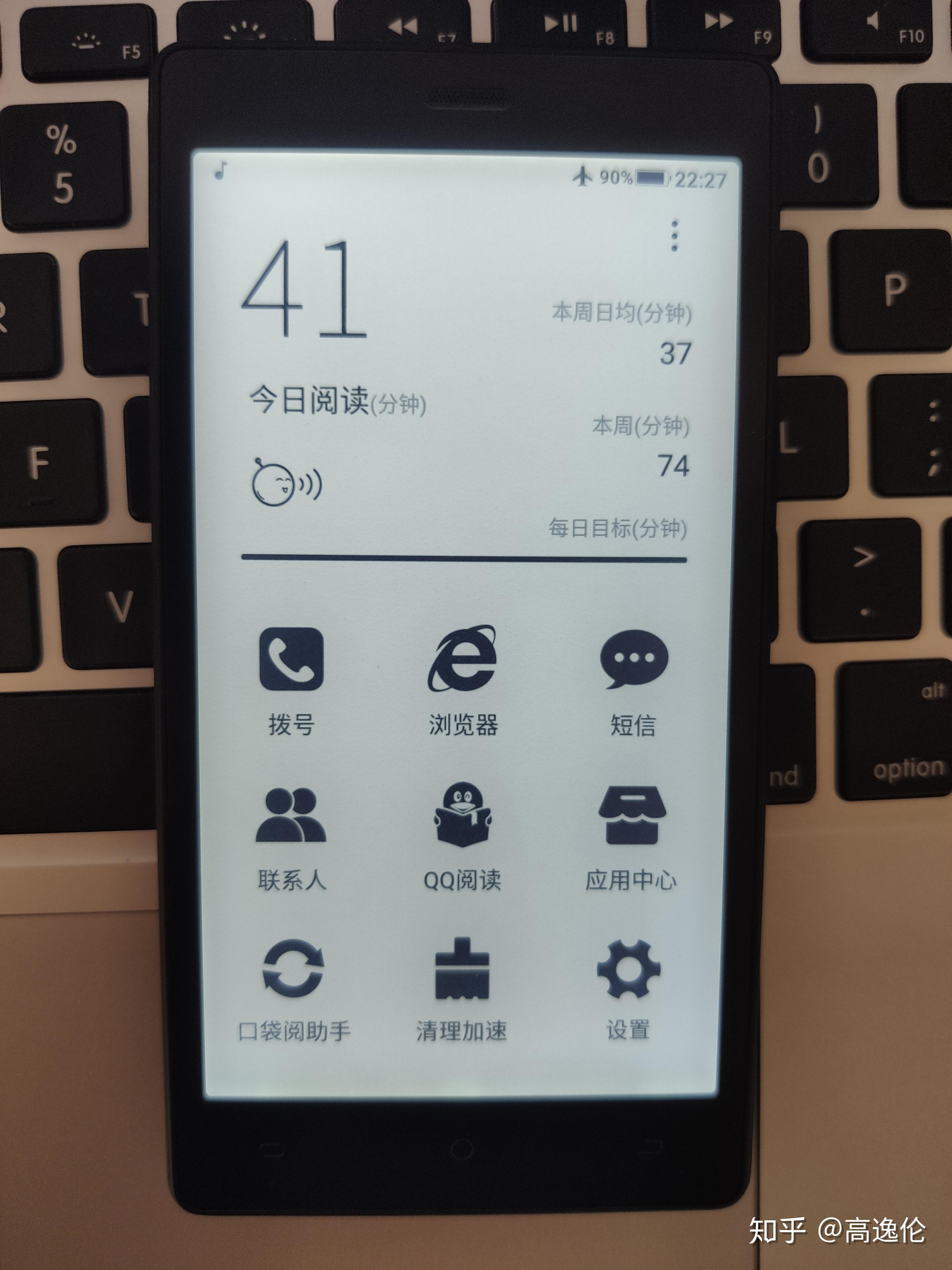 机器在桌面上能够看到今日阅读时长/阅读页数,下方是九个图标,有德律风、短信、联络人等通信功用,也能够通过阅读器阅读网页,QQ阅读图标现实感化和左下角触摸按键切换是一样的,口袋阅助手能够办理文件,应用中心能够翻开其他app。