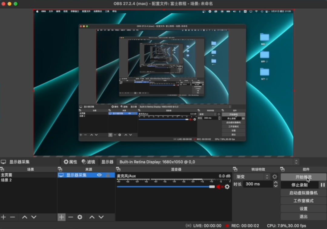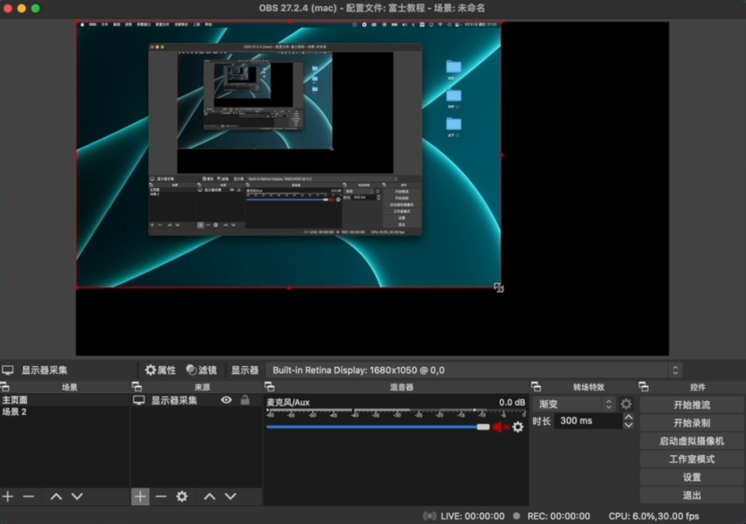 此时,“主页面”场景下共有两个来源,一个是“显示器收罗”(录造屏幕),另一个是“X-T4”(毗连相机)。