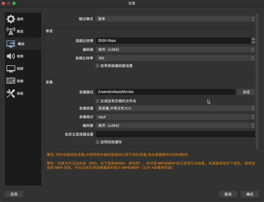 按照需求自行调整串流和录像的输出设置( 录像量量保举利用“高量量,中等文件大小”)。