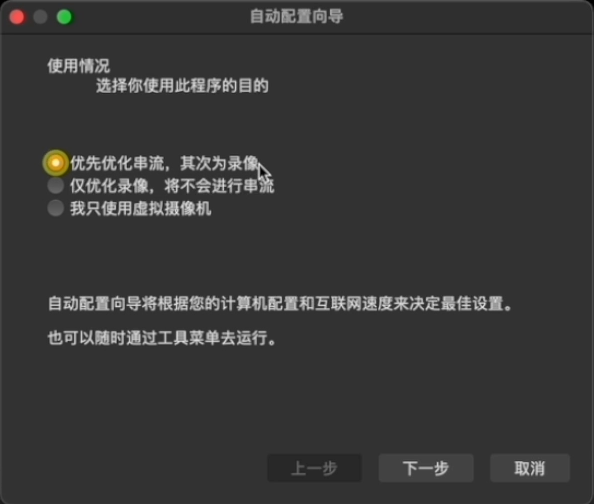 输入设置装备摆设文件名称完成后,弹出【主动设置装备摆设领导】窗口,我们按照需求自行选择利用情况选项( 保举利用默认选项,即“优先优化串流,其次为录像”)。