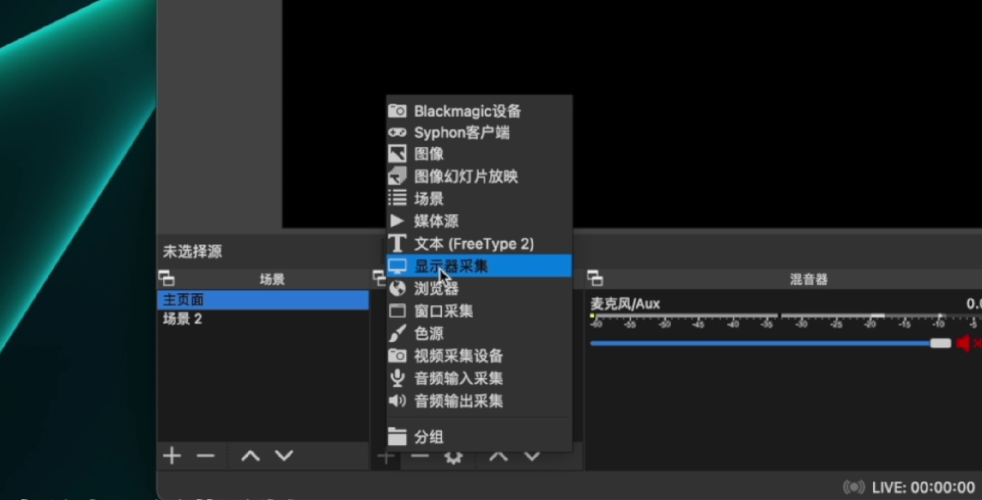 点击【来源】窗口中的“+”号,选择“显示器收罗”,就能够新建一个来源,用于收罗显示器画面。