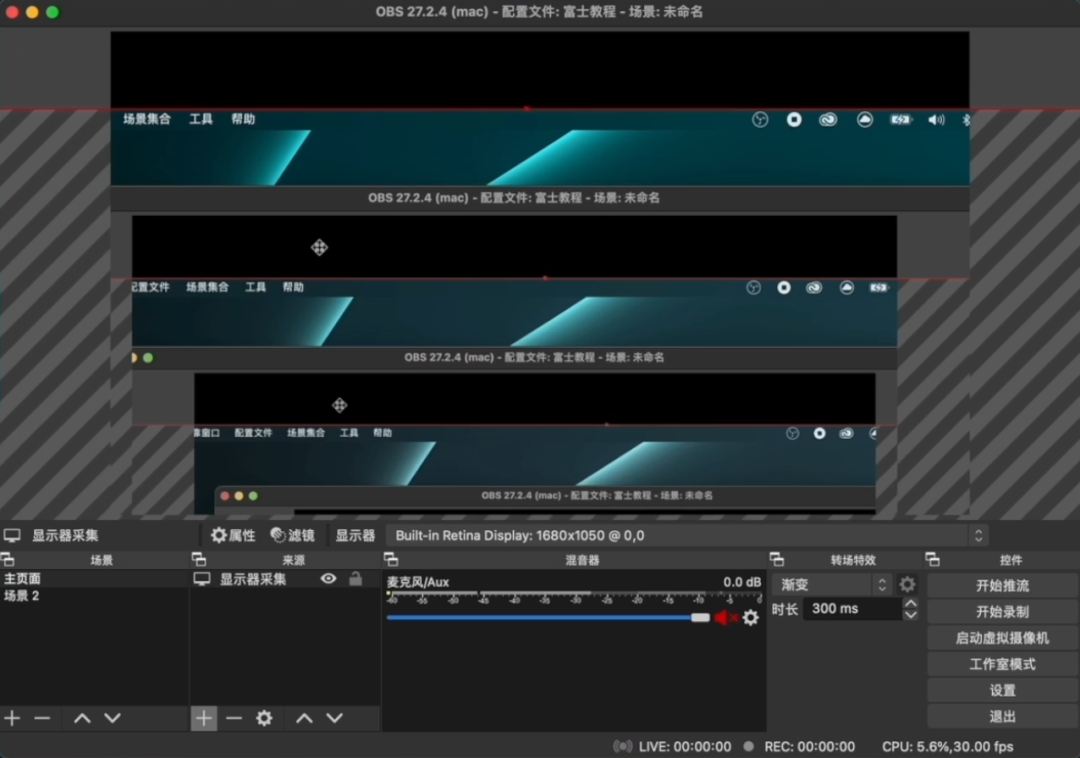 把“显示器收罗”拖到上方,然后缩小摆在左上角,再选中“X-T4”,缩小放在右下角。如许,“主页面”场景就包罗了两个画中画:显示器画面和相机拍摄画面。