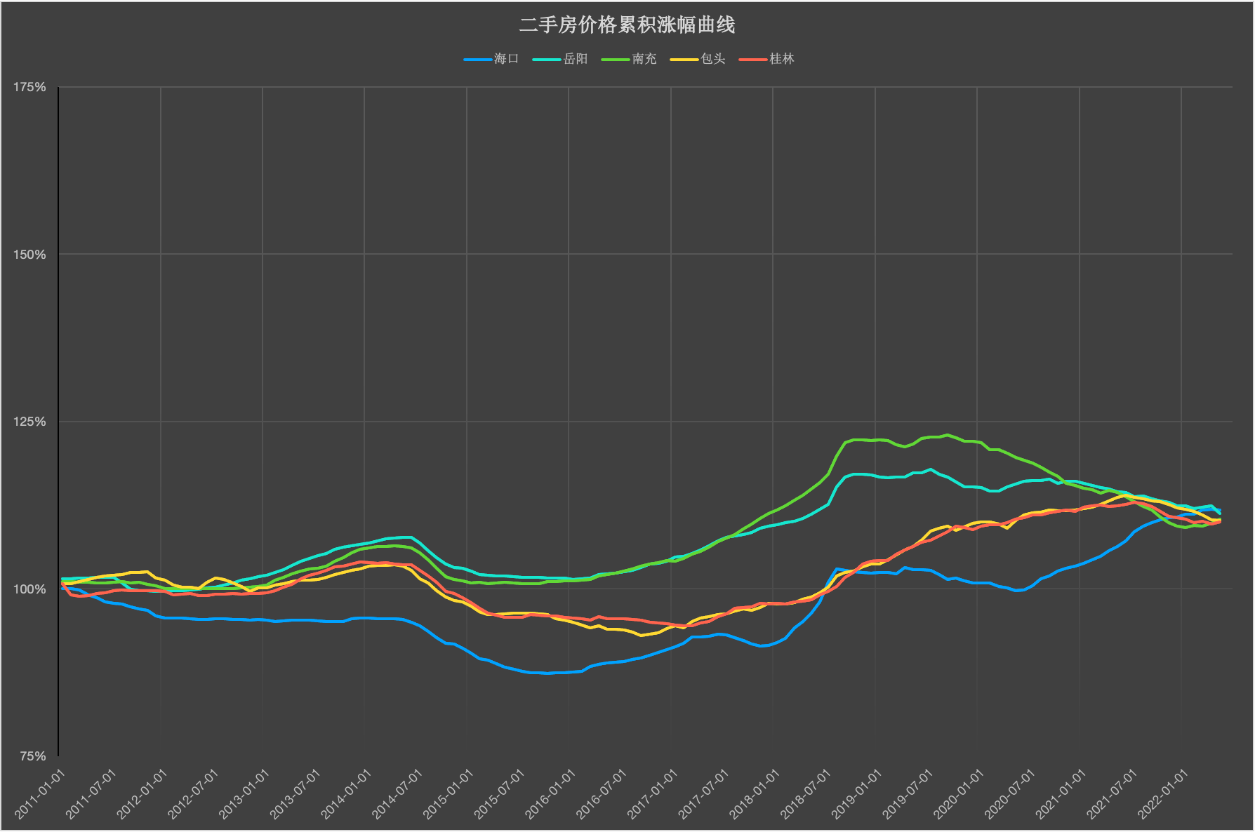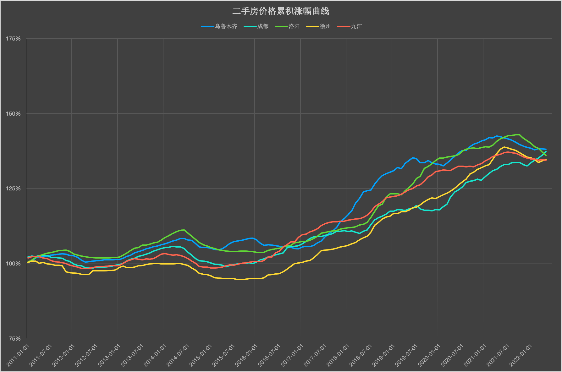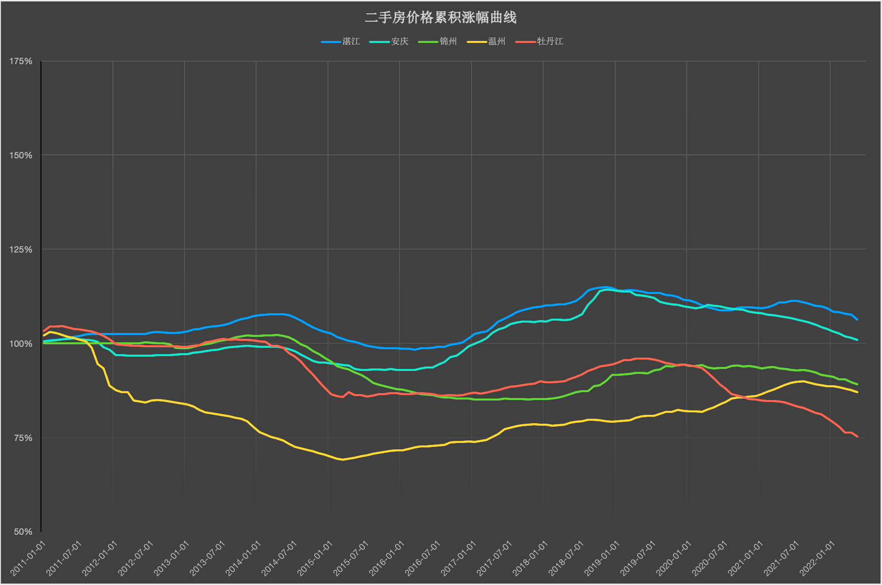 南京新房中,差别面积的新房价格的变革趋向根本一致,都呈现持续上涨的趋向,且大房子的涨幅略高于中小面积的房子;南京的二手房中,差别面积的房子房价呈现了比力大的分化: 面积大的房子在上涨时涨得多,鄙人跌时也跌得多;南京的二手房中,>144平米的房子近期的回调幅度到达9%(1.95-->1.86),90-144平米的房子价格回调幅度约4%(1.709-->1.668),90平以下的房子价格跌幅约5%(1.57-->1.52); 70城二手房价格累积涨幅曲线图70城二手房价格累积涨幅曲线图-2011年1月~2022年5月(5城/图)