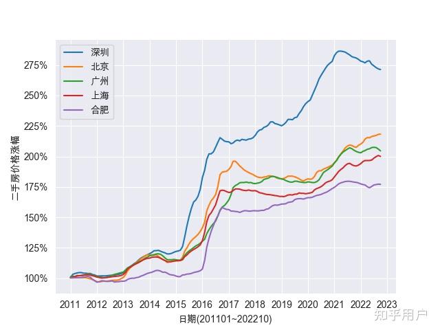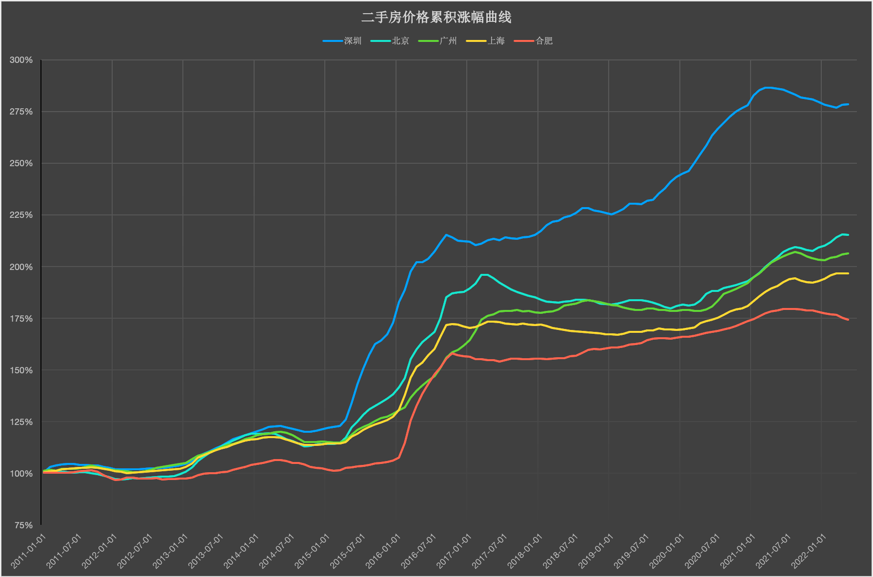 深圳、北京、广州、上海、合肥(纵坐标是75%-300%)*留意:此处纵坐标是75%-300%,为了展现变革的细节,后续城S的纵坐标将设置为75%-175%;