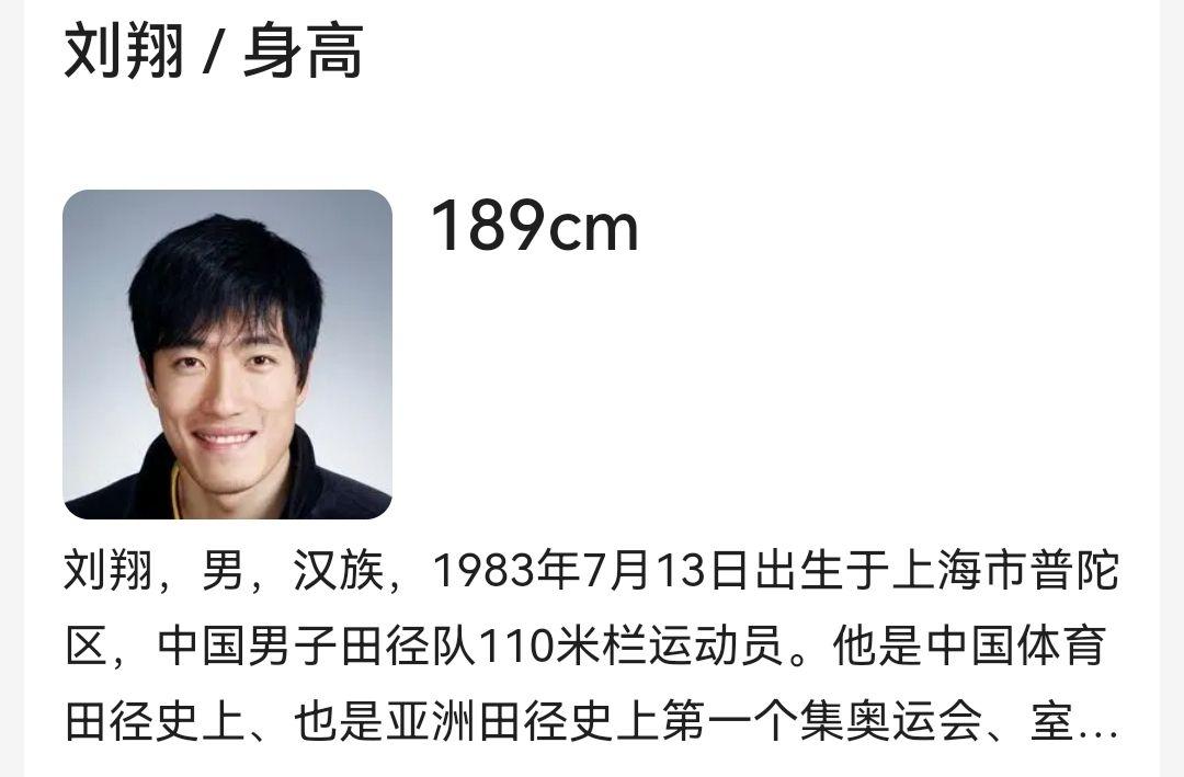 刘翔官方身高189,也有处所是188,晚净就是188摆布,若是张梓琳报矮了,那么刘翔也报矮了,可田径运发动完全没需要虚报,刘翔在跨栏运发动里也并非更高。
