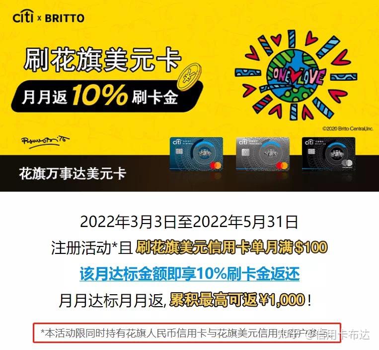 2022年3月3日至2022年5月31日,注册活动,刷花旗美圆信誉卡,单月满100美圆,享10%刷卡金返还。