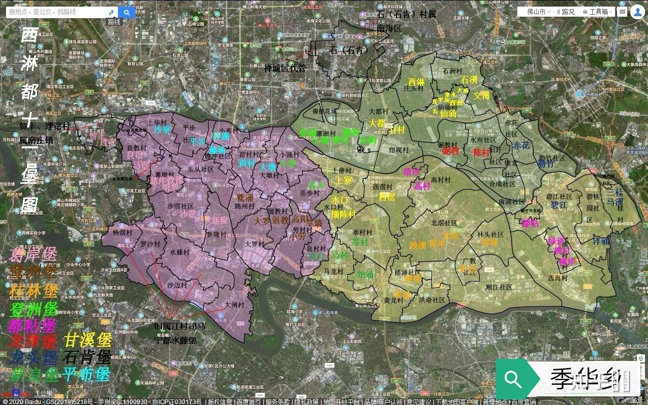 南海顺德两县志书都记载乡被都取代,那么西淋都本来就是季华乡了。也可知西淋都的范畴就是季华乡的范畴。按照材料找出明清南海县和顺德县各自的西淋都的范畴后,合并得出最后西淋都的范畴在2010版《佛山市地图》显示,看下第一幅图!而第二幅图是佛山中心组图的范畴。