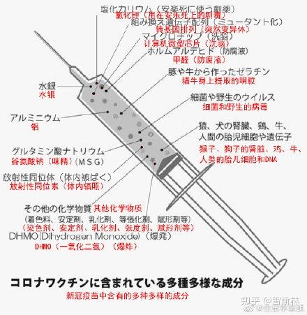 还有的人强烈抵触疫苗接种,各类阴谋论同化在一路,使得疫苗那个本来能最快帮忙日本控造住疫情的体例霎时妖魔化。光看那张日本互联网传播很广的所谓疫苗成分科普图就足以窥见他们事实有多抵触,以至弱智到令人发笑:
