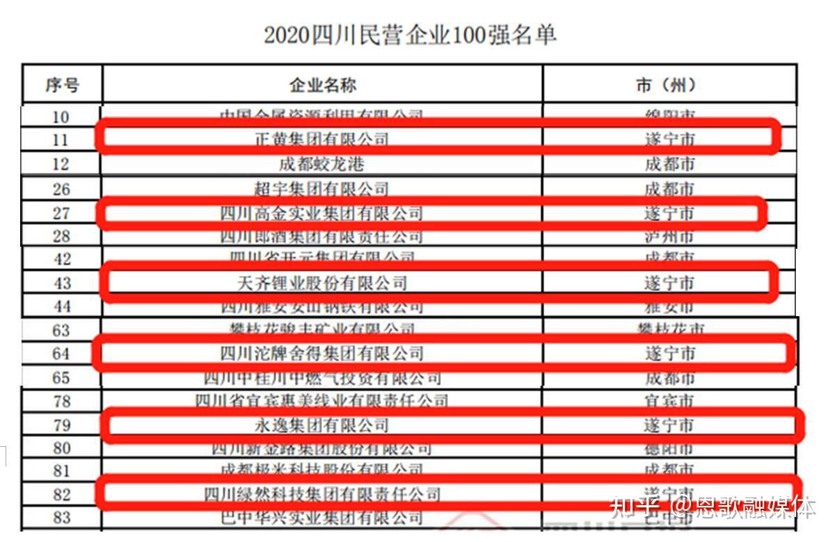 此外,据遂宁市经信局,2020年9月29日,四川省工商联发布2020四川民营企业100强榜单和调研阐发陈述,正黄集团有限公司、四川高金实业集团有限公司、天齐锂业(002466)股份有限公司、四川沱牌舍得集团有限公司、永逸集团有限公司、四川绿然科技集团有限公司进入榜单。