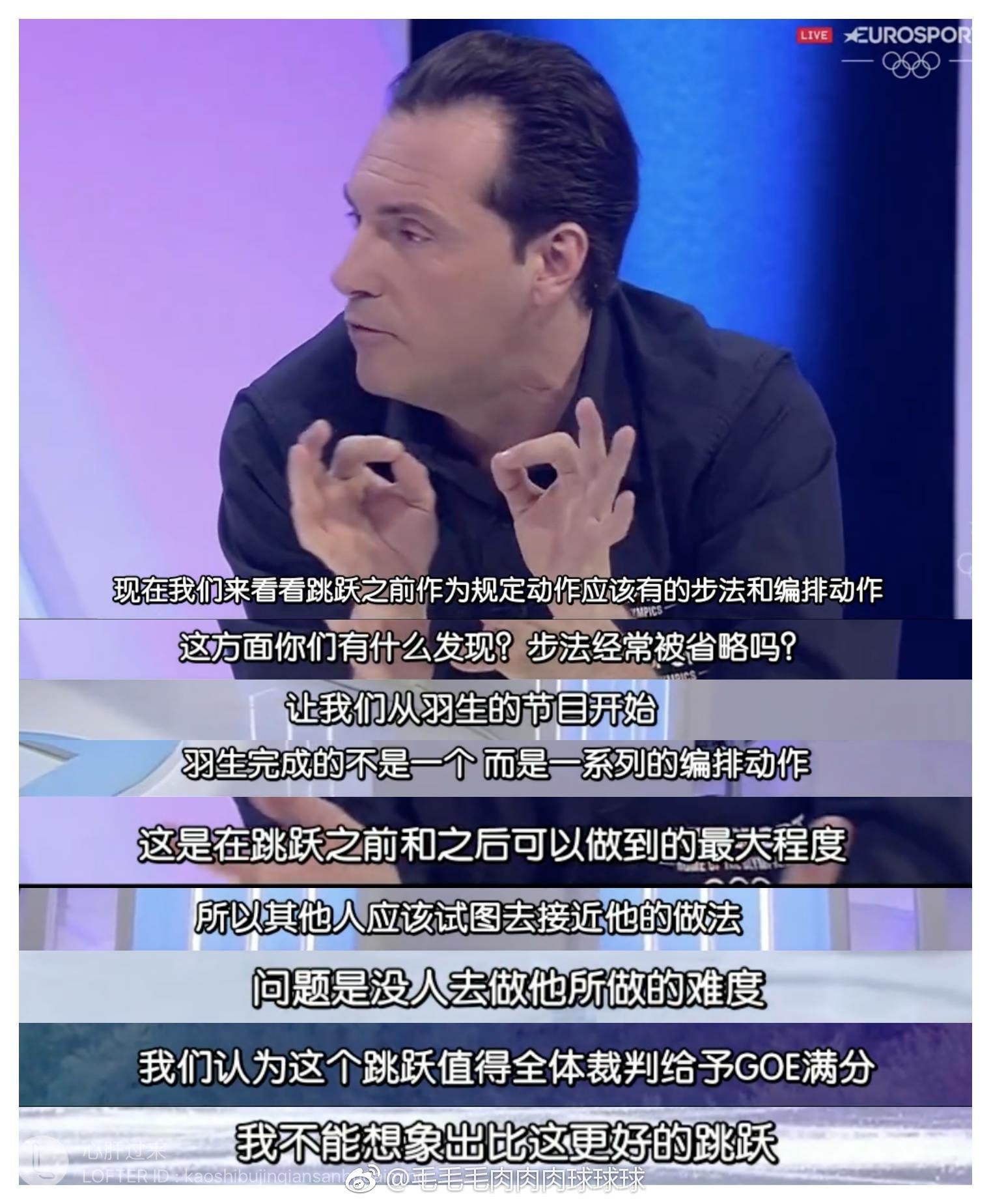 翻译:昌磨和羽生君不是统一品种型,昌磨是可以间接表示出艺术性的类型。他比力地道,是坦率单纯地在演出。因为他比力有活力。而羽生君是那种(操纵演技)演出的类型。