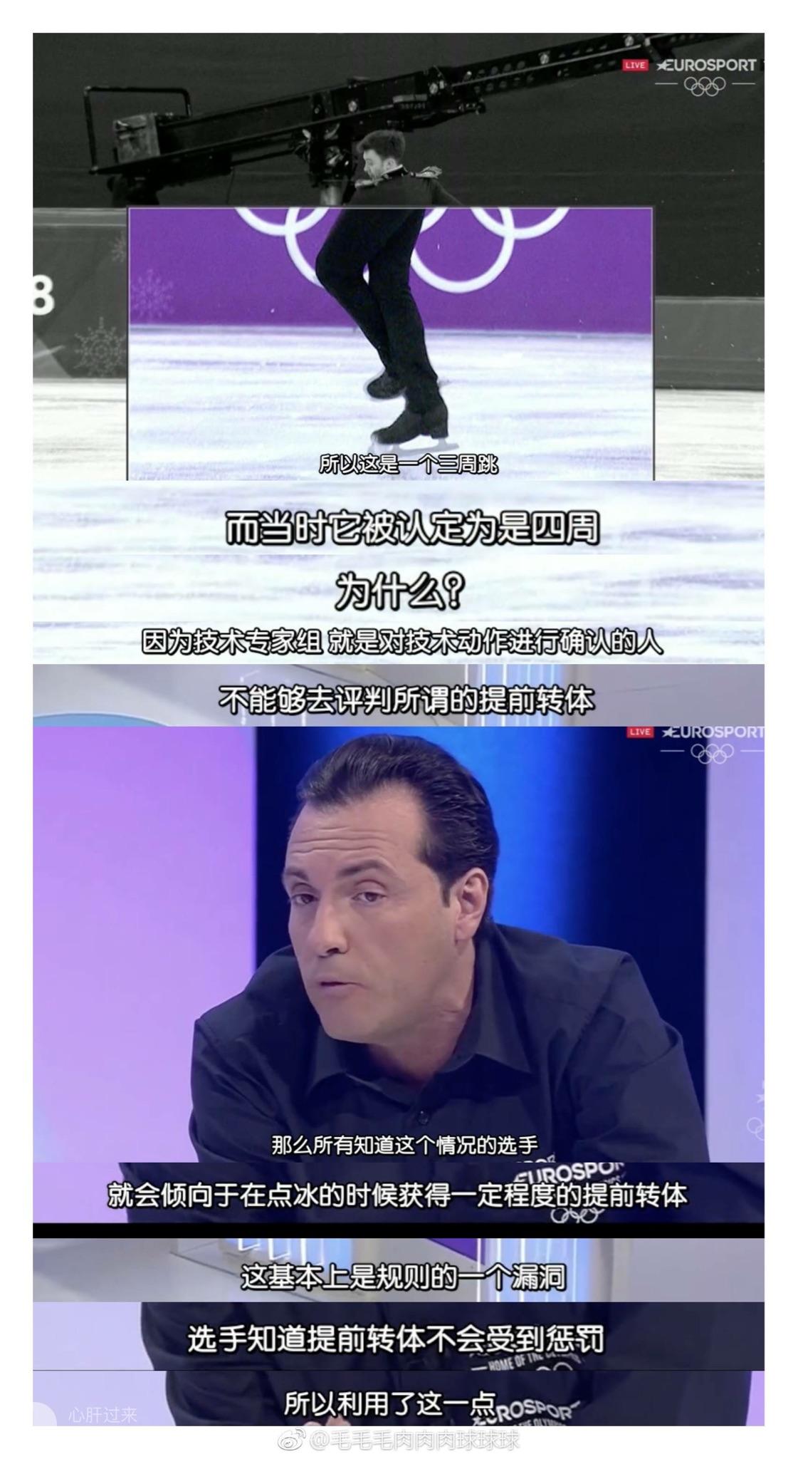比照羽生结弦的goe加分项延迟转体,宇野的提早转体看起来了更明显了,而且他的提早转体已经到达270度,远远大于规则默许的180度pre(留意转体时宇野脚下的位置以及羽生结弦脚下的位置,羽生转体时脚已经完全分开冰面,而宇野曲到270度脚还停留在冰面,讲实就算是女单几个也没pre成如许的)