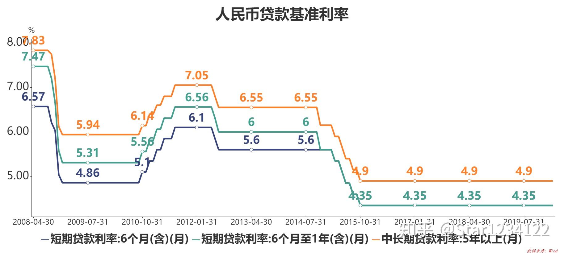 能够根据期限停止划分,下图是自2008年居民在贸易银行,6个月短期、1年、5年以上中持久贷款利率走势图,能够看到自2015年12月份以来,短期、中短期贷款利率连结在4.35%,中持久贷款利率连结在4.9%。