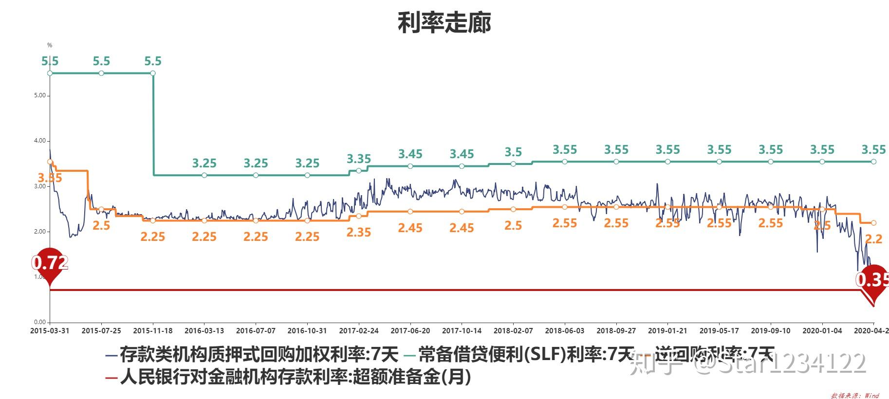 利率走廊上限是贸易银行在央行的贷款利率,凡是将SLF利率(常备借贷便当)当做利率走廊上限。当前SLF利率隔夜3.4%,7天3.55%,1个月3.90%。