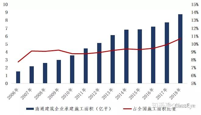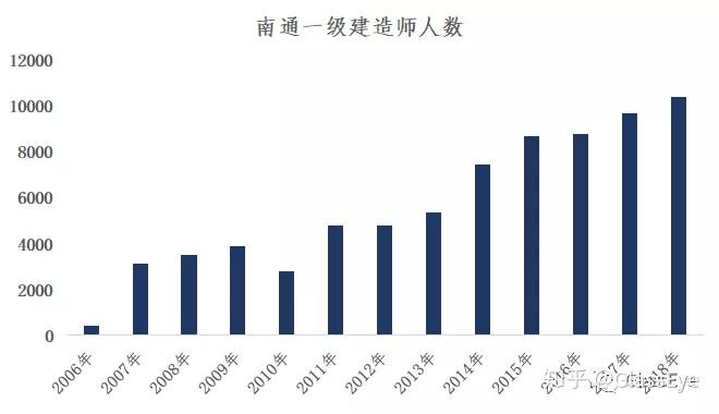 (图:南通一级建造师人数2018年为10382人,同年江苏省为66490人)拥有庞大建筑团队及一级建造师的南通,其承建的施工面积已到达全国总面积的10%。