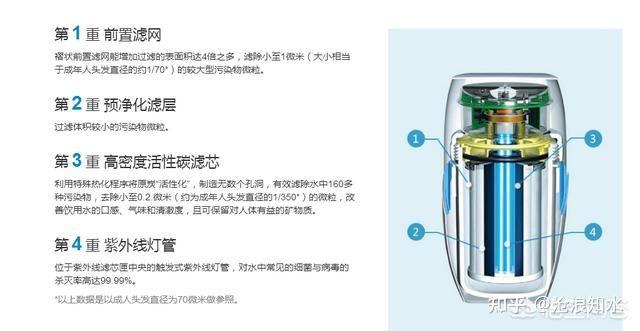 图中说第1重前置滤网的过滤精度为1微米,第3重高密度活性炭滤芯能“去除小至0.2.微米(约为成年人头发曲径的1/350*)的微粒”,虽说活性炭不克不及用过滤精度来权衡其滤除才能,我们今天就借坡下驴,就当是安利清水器有0.2微米的过滤精度吧。