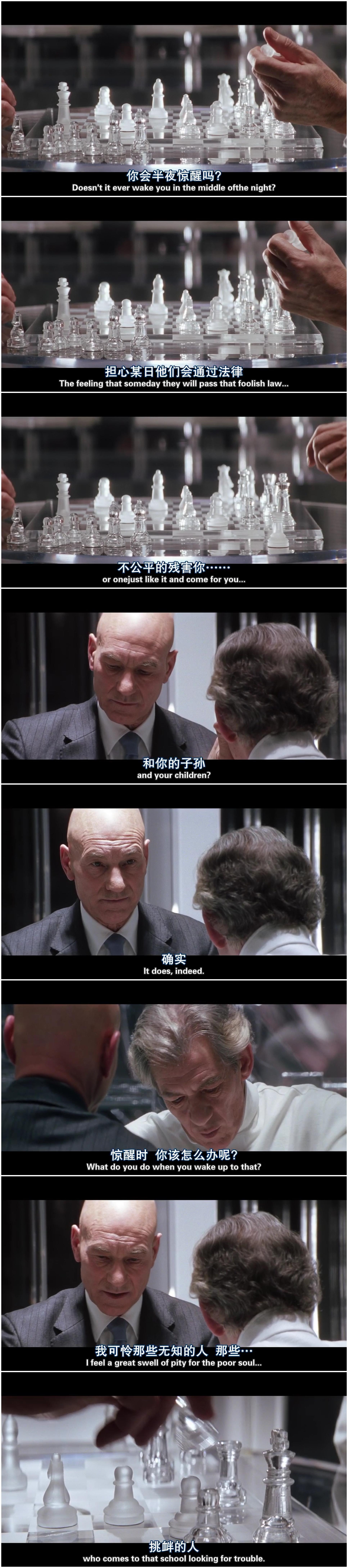 二十二、影片的最初,万磁王问X传授能否会在夜里惊醒,担忧有人会从XX抢走他的学生。X传授答复道他为前来XX闹事的蒙昧灵魂感应同情。那段对白恰是完美致敬了16年前《X战警1》中两人在塑胶监狱里下棋时停止的对话。