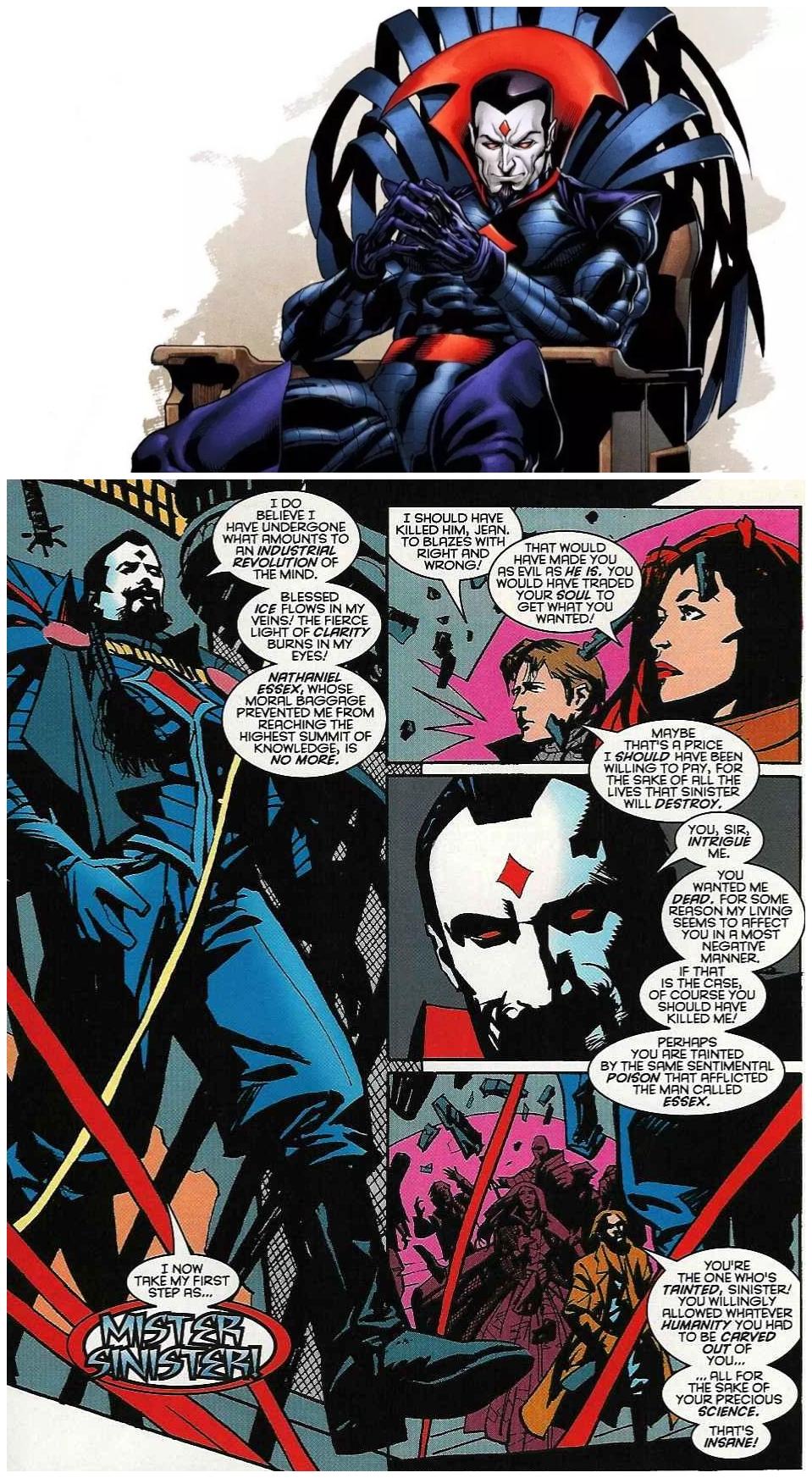 惊恶先生初度退场于《Uncanny X-Men Vol 1 #221:Death by Drowning!》(1987年9月),是一名激进的基因遗传学研究专家。他提出在不久的将来,地球上会呈现一多量变种人的理论。在接触清醒的天启之后,他酿成了一个不死的变种人,而且成为了一个险恶的反派科学家。从此纳撒尼尔·埃塞克斯(Nathaniel Essex)就自称惊恶先生。“Sinister”那个单词是纳撒尼尔·埃塞克斯的老婆临末前不断所念叨的,所以惊恶先生(Mister Sinister)由此得来。惊恶先生最有名的尝试项目就是他缔造了琴葛蕾的克隆体玛德琳·普赖尔(Madelyne·Pryor),她也就是之后暴怒酿成红皇后的女人。而且摆设她和镭射眼(Cyclops)成婚,后生下一个男孩,代号电索。
