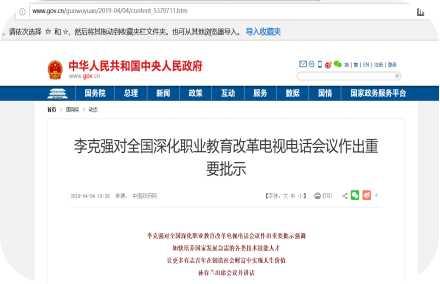 2019年4月4日,全国深化职业教育变革电视德律风会议在京召开。中共中央政治局常委、国务院总理李克强做出重要批示。批示指出:开展现代职业教育,是提拔人力资本本质、不变和扩大就业的现实需要,也是鞭策高量量开展、建立现代化强国的重要行动。要进一步变革完美职业教育轨制系统,积极鼓舞企业和社会力量兴办职业教育,补上凸起短板,鞭策产教交融,出力培育开展一批高程度职业院校和品牌专业,加快培育国度开展急需的各类手艺技强人才,完美人才评价鼓励机造,持续推进职业技能提拔动作,让更多有志青年生长为能工巧匠,在缔造社会财产中实现人生价值,为经济社会持续安康开展供给更好的人力人才资本保障。