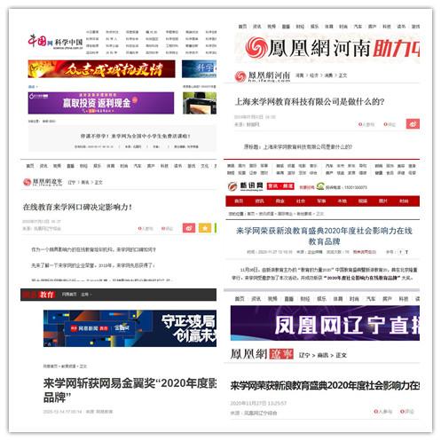 2020年,来学网再接再厉,先后荣获新浪教育盛典“2020年度社会影响力在线教育品牌”、网易金翼奖“2020年度影响力在线教育品牌”、新华社教育论坛“2020年度•影响力职业教育品牌”、央广网教育峰会“2020年度品牌公信力教育机构”以及搜狐教育盛典“2020年度行业影响力在线教育机构”等多项大奖。