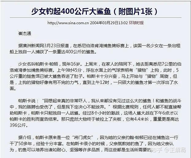澳洲少女钓起400公斤大鲨鱼的新闻报导 图片来源:全球时报新浪网新闻中心账号