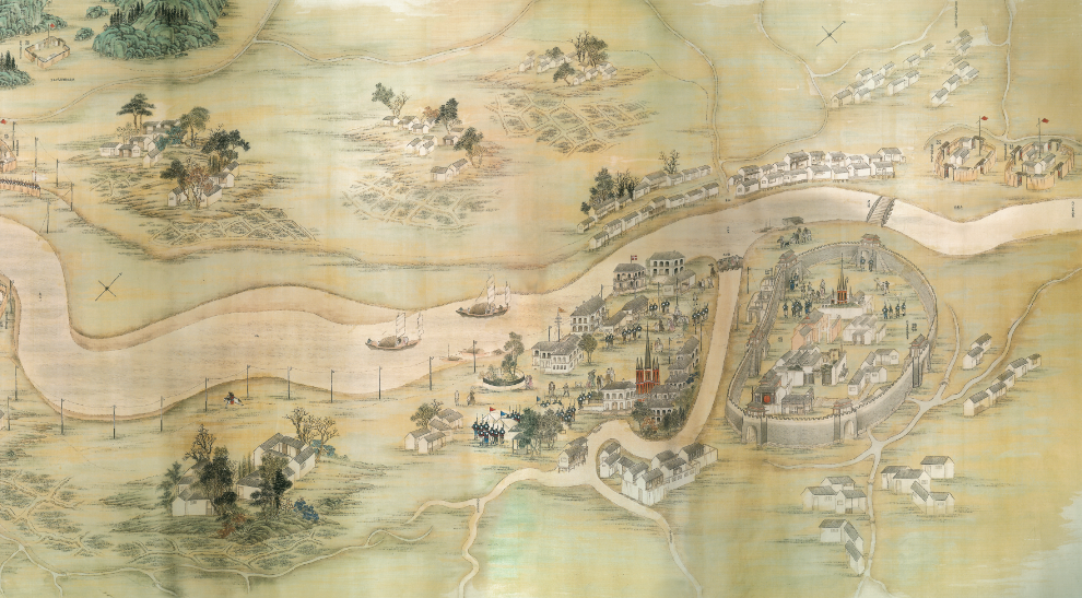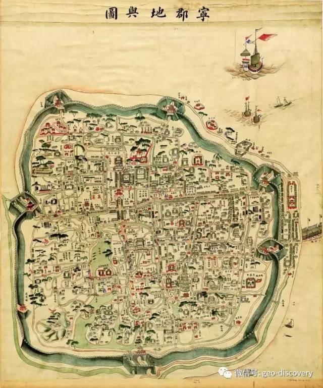 《宁郡地地图》为清道光以前绘造的宁波城市地图,右上角有海运大船、内河小船,城内街道、建筑、商铺、桥梁等等逐个俱全。此图现藏于美国国会藏书楼▼