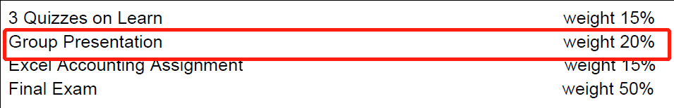 ASSIGNMENT,你能够把它简单理解为“家庭功课”,也可能包罗除了quiz、essay、exam等可叫出名字以外的所有使命,好比上面Acounting教师就把“EXCEL ACCOUNTING”归为了assignment,占比也有15%,详细使命是需要用excel做张财政报表。