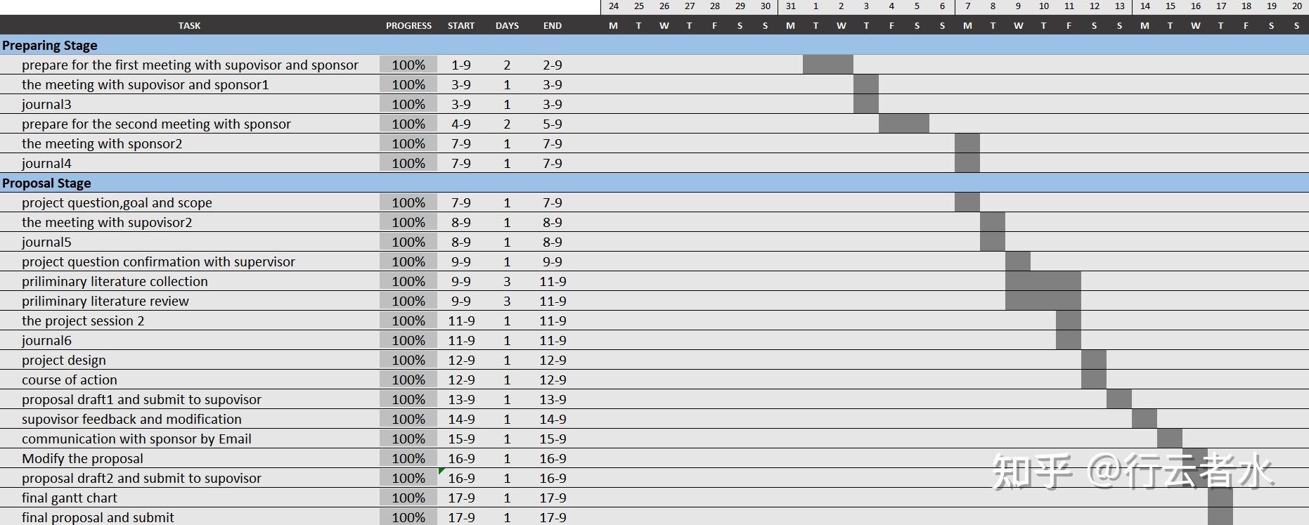 整个project是12周(3个月),此中proposal是3周-4周;一般在第一周就需要用甘特图做个时间方案表,其实那个方案更多是做给本身看的,教师倒不会按照那个时间方案跟进,因为能否定期完成,只会影响本身能否定时结业,教师也不会催,因为他们觉得那都是你本身的工作,完不成就申请延期结业,耽搁的是本身的时间和money。