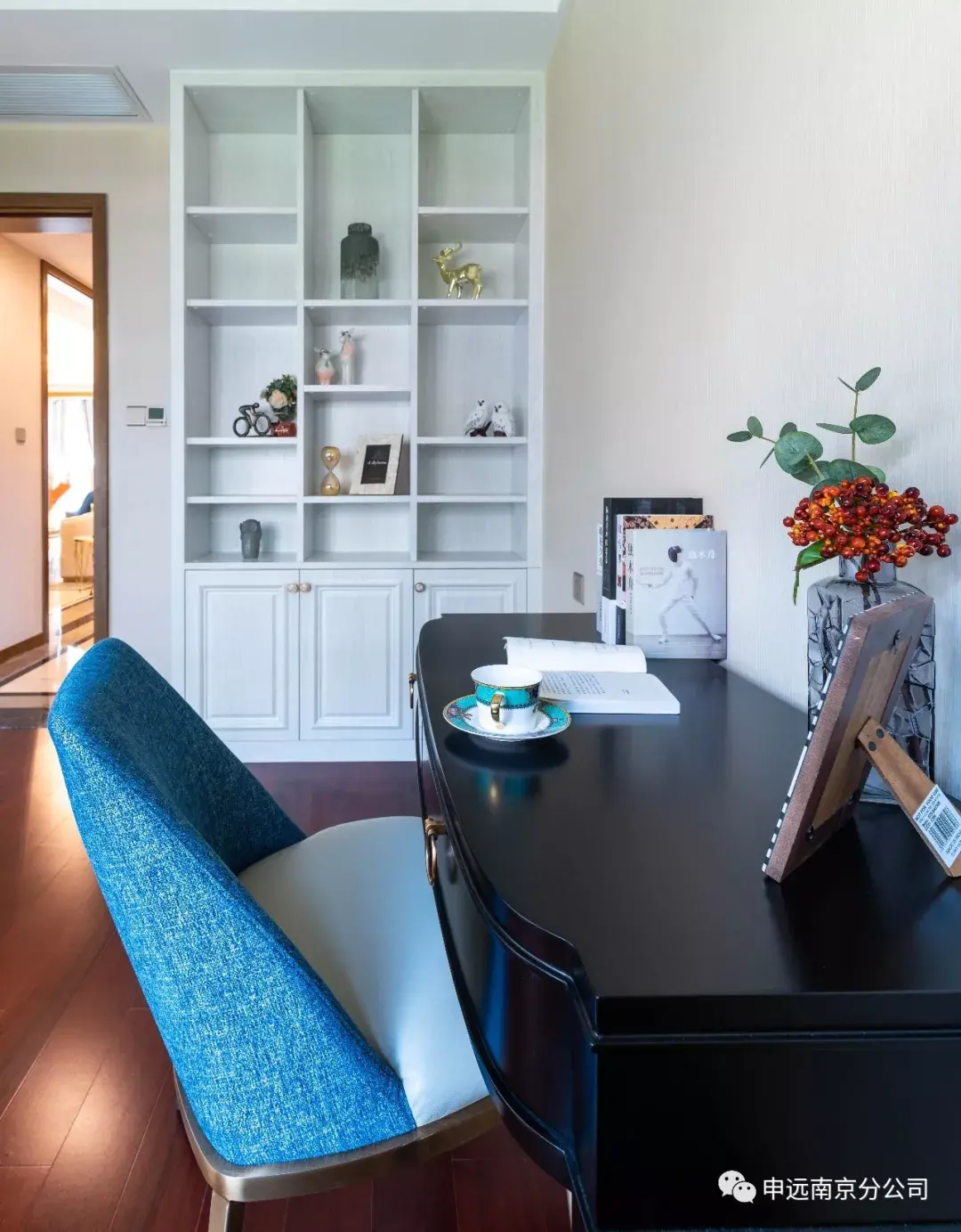 书房是家中家具起码的区域,顶天登时的陈列柜既能够放置艺术品也能够放置册本,书桌放置中央,搭配动物,让书房的功用性完全显出。