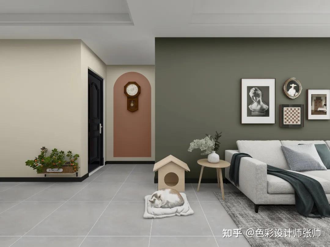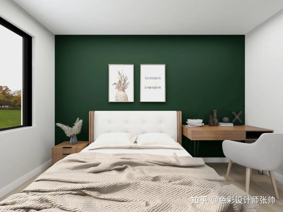 在家庭拆修时,一面茶青色的布景墙长短常好的选择;绿色和淡蓝色的大地色系搭配也长短常棒的组合。
