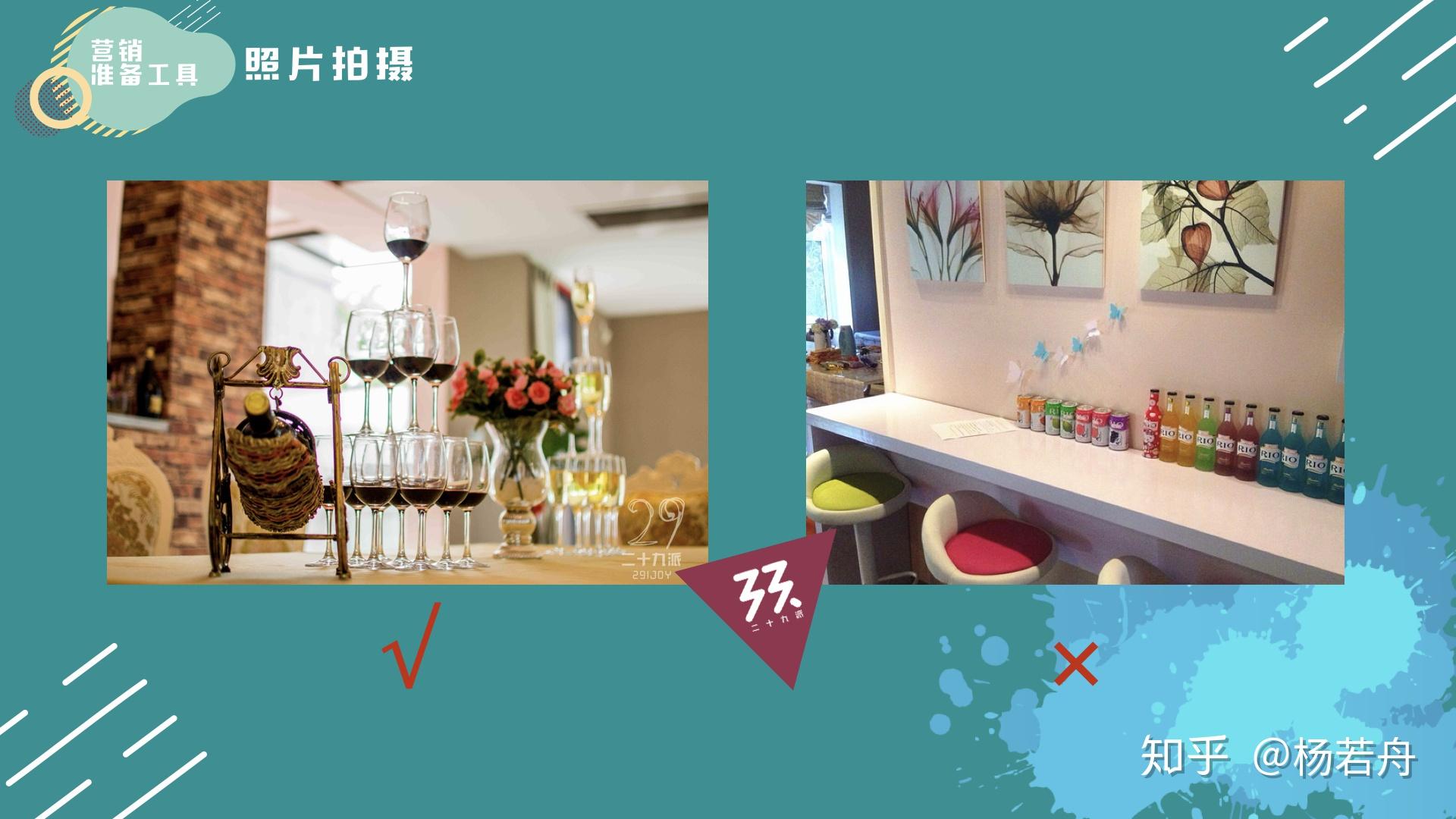 上图中右边是二十九派的一套别墅,右边是某家轰趴馆的照片。起首右边酒瓶摆放的十分简单,其实那里是有讲究的,酒水摆得都雅能产生额外的消费。其次桌上还有杂物,以及那个拍摄角度底子无法展示情况的长处。以上即是右边照片的一些瑕疵,比拟之下右边的照片看起来就很恬逸。