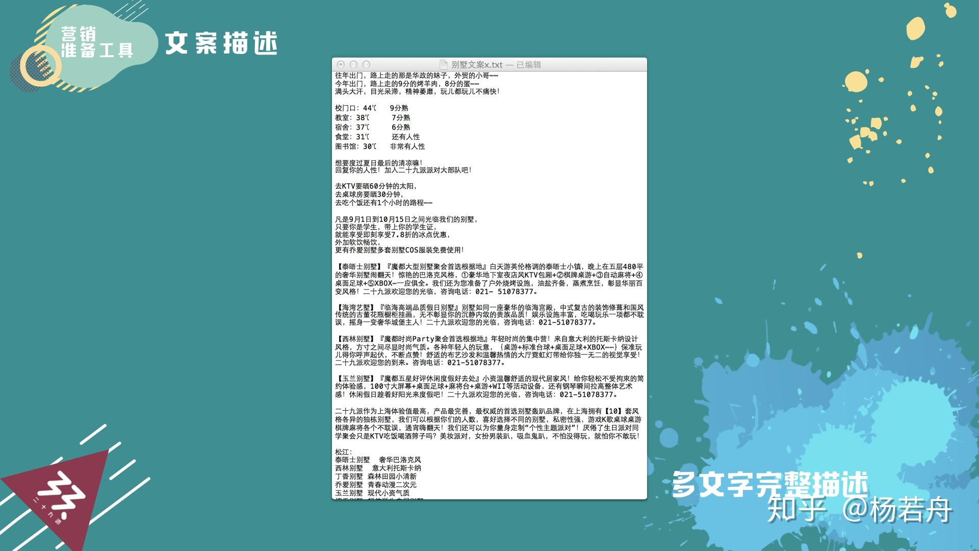 起首,要筹办一个完好描述版本用做介绍。我们以前为一间轰趴馆,写过至少30多种差别篇幅的版本,去适用各类场景;