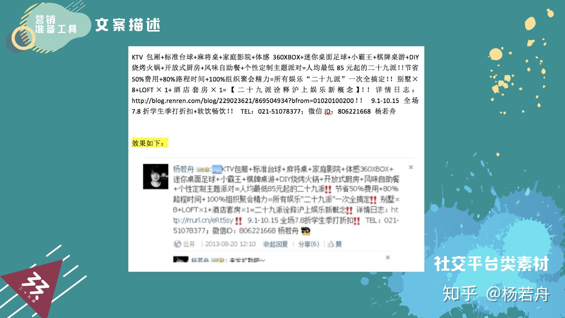 别的,还需要一些社交平台类素材。好比上图中的案牍内容是我们做的案牍推广,2013年时在人人网和微博上火了很久。因为它文字很简短,也合适在伴侣圈上发布,而且内容很精炼,把客户实正感兴趣的内容全都表达出来了。