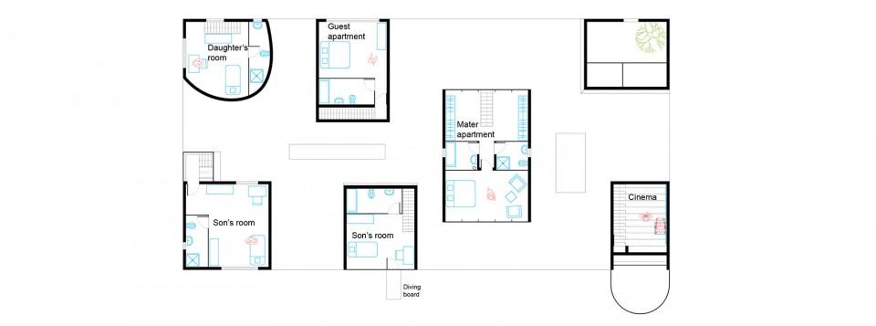 奇普的另两个事例,以栏杆为核心理念,南区了了。几层金沟线停放,四层卧室,四层餐厨加挑空卧室,再加上玻璃屋。在那里,公用内部空间放到下部,私认为奇普是为了充实表现一种捷伊日常生活运营理念。