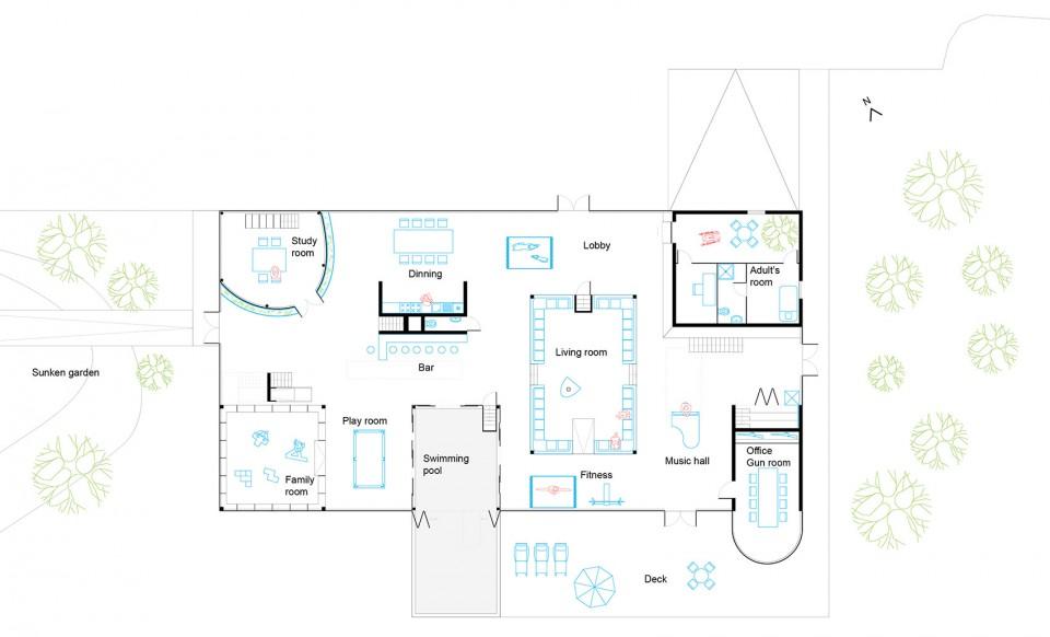 该写字楼为多机能家庭聚会型,入口层为公用内部空间,四层全淋浴间内部空间,那种房子合适开派对。