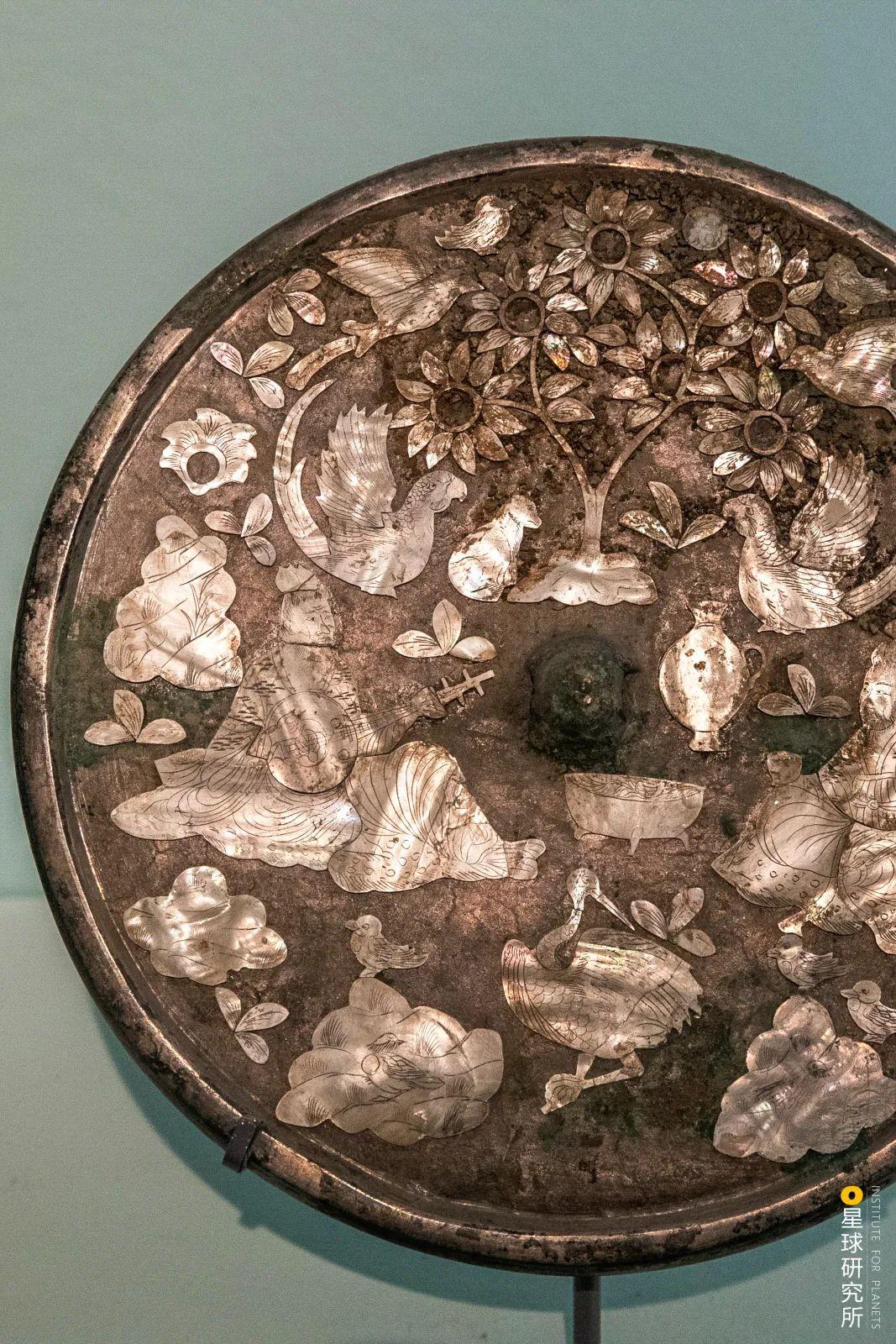 37.高士宴乐纹嵌螺钿铜镜,将螺蚌贝壳镶嵌工艺运用于铜镜之上,为唐朝初创,摄影师@柳叶氘皇宫贵族所用的丝绸织品,历经千年仍色泽鲜艳。
