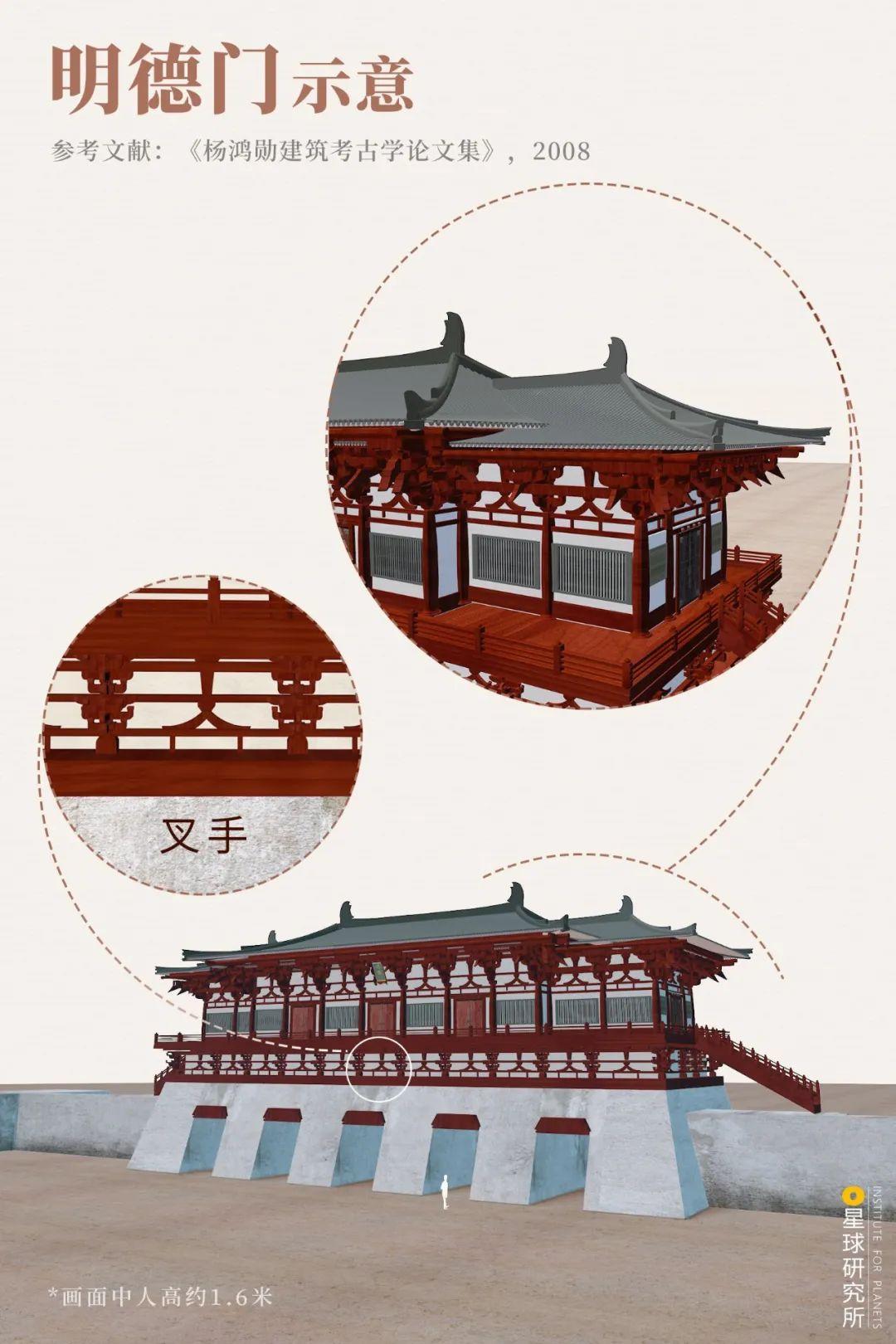 17.明德门示意,参考文献为《杨鸿勋建筑考古学论文集》,造图@杨宁&王申雯/星球研究所其上方冠以木量的城楼,下方的夯土墙以砖贴面。巨大的斗拱、严肃的建筑代表了长安城的门面与形象,数以百计的马队和步卒驻扎在此、重兵扼守。