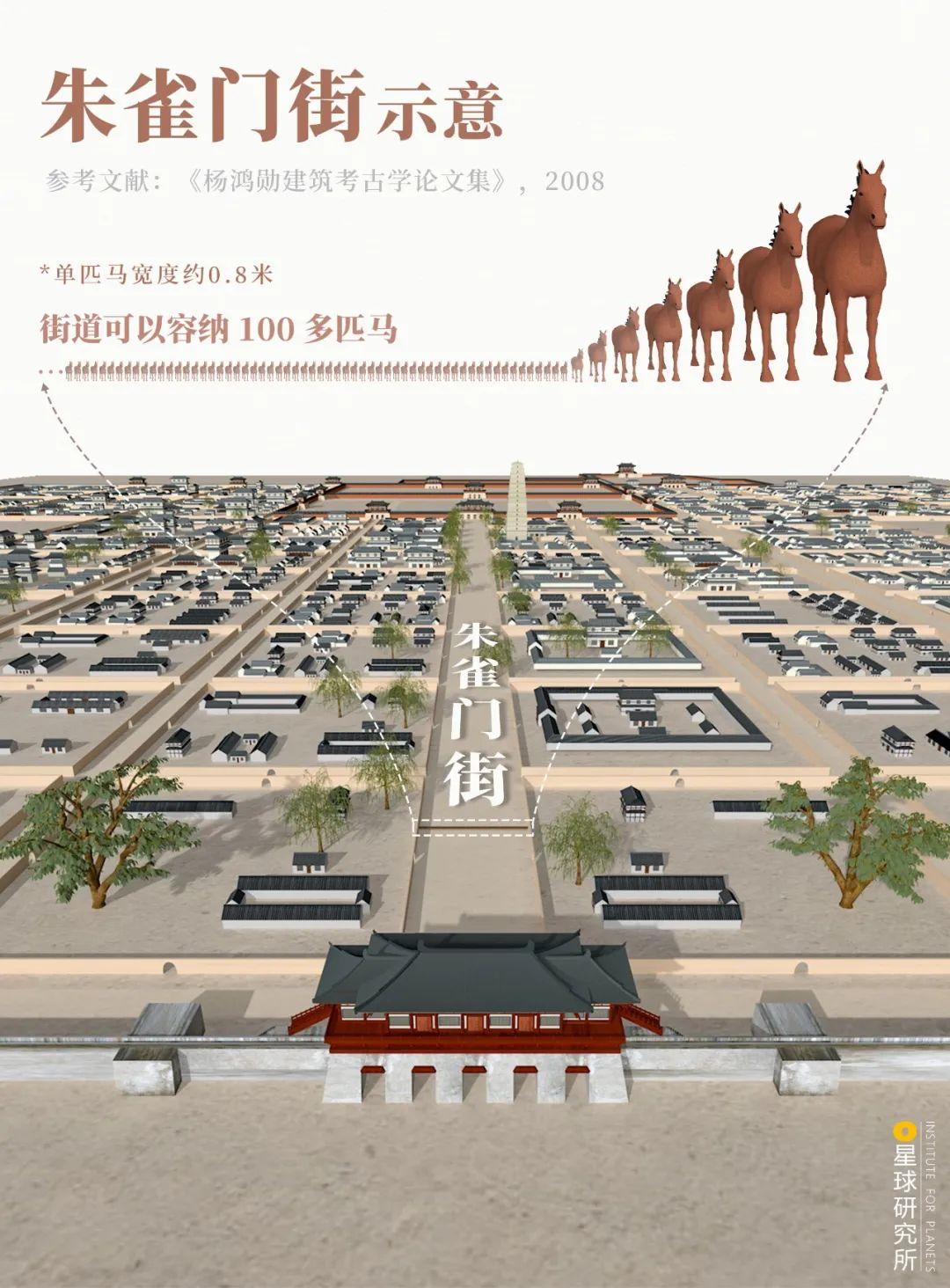 15.长安城六街示企图,造图@杨宁&王申雯/星球研究所六街中最宽广的墨雀门街被尊称为“天街”,其将整座长安城一分为二,宽度约为150米,能够包容约100多匹马齐头并进。