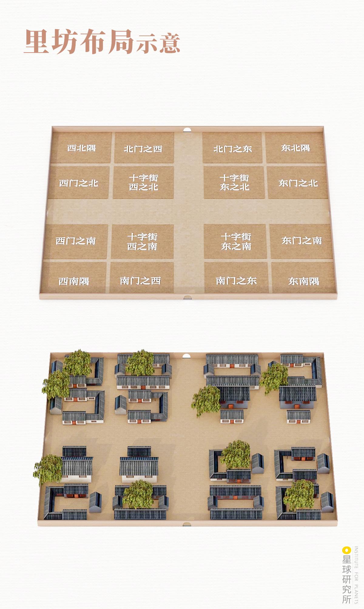 19.里坊规划示企图,上文中鼓声的描述出自《新唐书》中的“鼓自内发,诸街鼓承振,坊市门皆启,鼓三千挝”,造图@杨宁&王申雯/星球研究所在长安城的清晨,宫城正门上的城楼敲响第一声报晓鼓,100多个里坊的鼓声依次跟进,同时城内200多所寺庙会碰响晨钟,层层宫门、城市的城门、各个里坊的坊门依次缓缓开启,正所谓: