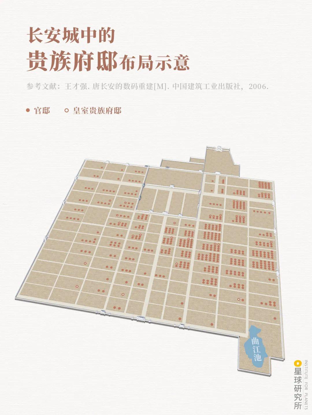 28.唐长安名人居所示意,上文别离引自李白的《少年行二首》、孟郊的《登科后》,造图@陈景逸/星球研究所从街道、城门、里坊再到园林,近百万长安人在此安身立命。