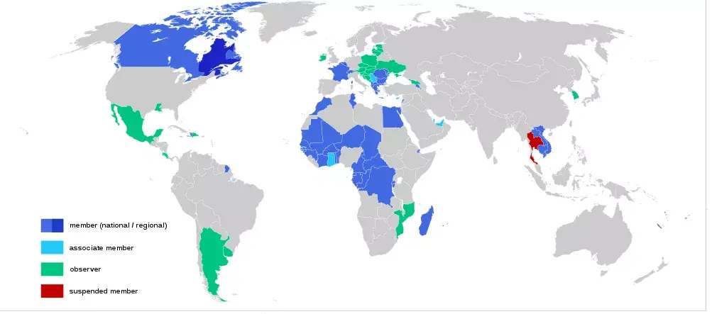 “法文当今世界”(Francophonie)有54个成员国或地域、7个准会员国或地域,27个察看员国或地域,共88个北欧国度和政府成员,超越结合国成员数的三分之一,笼盖了五大洲超越9亿生齿。