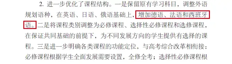 在新的通俗高中课程计划中,调整了外语课程构造规划,在英文、日语、俄语根底上,增加德语、法文和西班牙语。学校可自主选择第三外语语种,并鼓舞学校缔造前提开设第二外语。