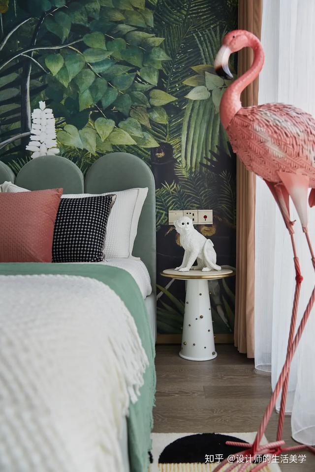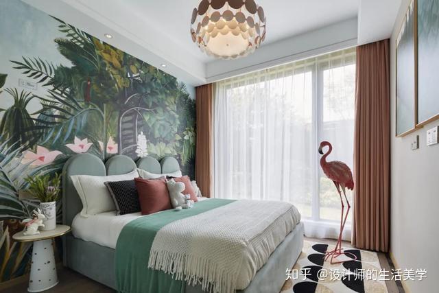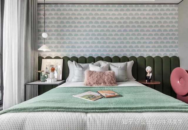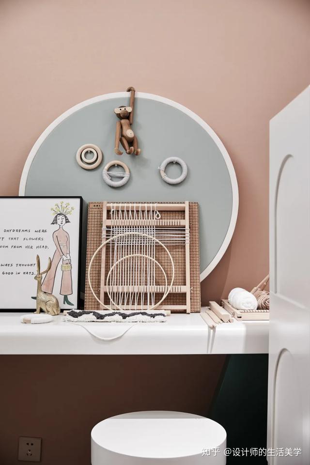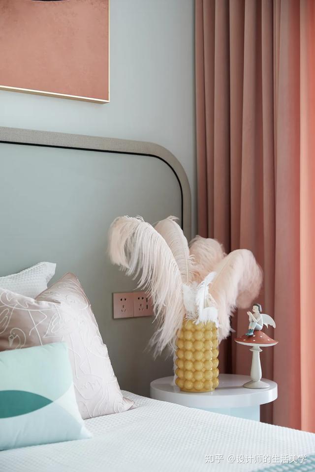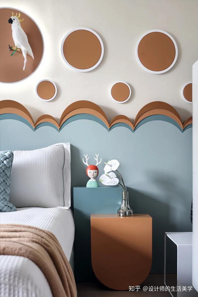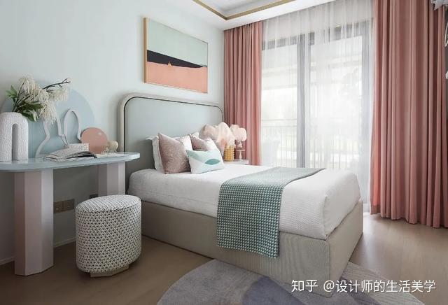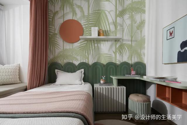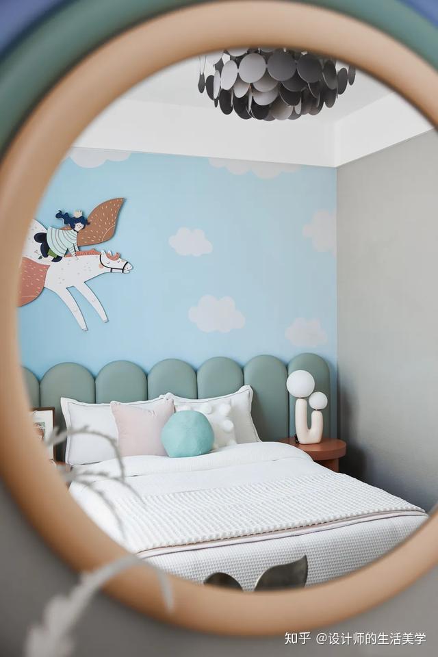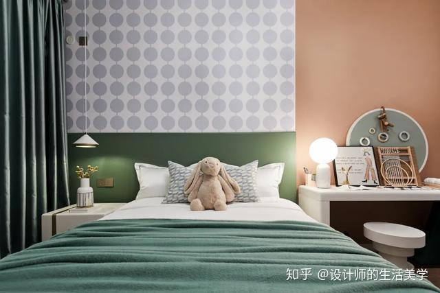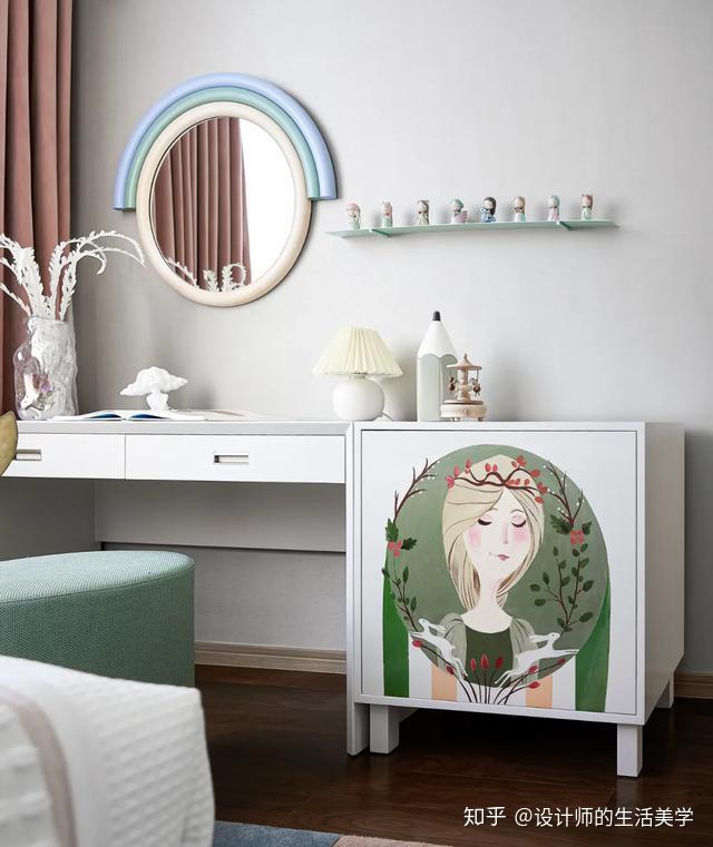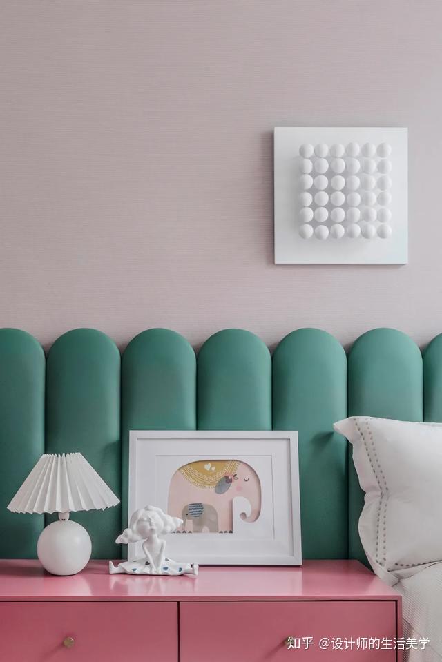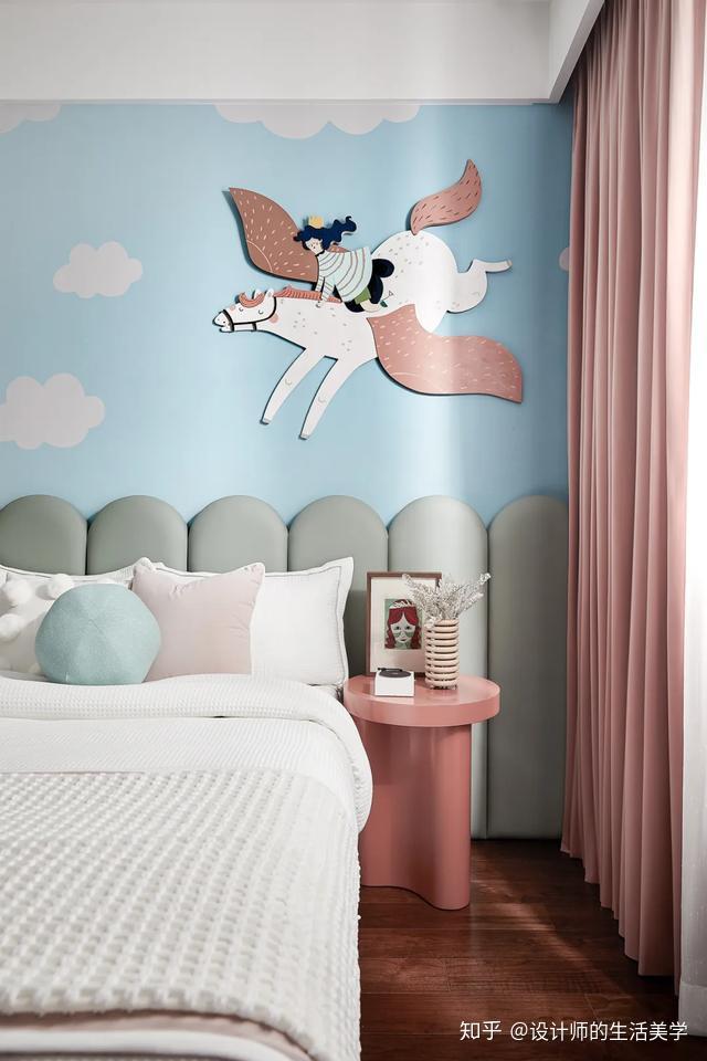 女孩房仿若柳绿桃红的森林,似云彩又似温顺的海浪的童梦构造设想的床沿,围绕森林小公主展开的童梦内部空间。量感的马卡龙色加一点灰色,低饱和度又更添清爽大天然。
